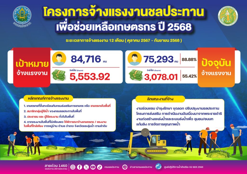 นายสุริยพล นุชองนงค์ อธิบดีกรมชลประทาน เปิดเผยความคืบหน้าโครงการจ้างแรงงานชลประทานว่า ในปีงบประมาณ 2568 กระทรวงเกษตรและสหกรณ์มีเป้าหมายจ้างแรงงานรวม 84,716 คน เป็นระยะเวลา 12 เดือน (ตุลาคม 2567 – กันยายน 2568) เพื่อสร้างรายได้เสริมแก่เกษตรกรทั่วประเทศ โดยจังหวัดที่มีการจ้างแรงงานมากที่สุด 3 อันดับแรก ได้แก่ สกลนคร จำนวน 5,230 คน อุบลราชธานี จำนวน 3,692 คน และกาฬสินธุ์ จำนวน 3,130 คน