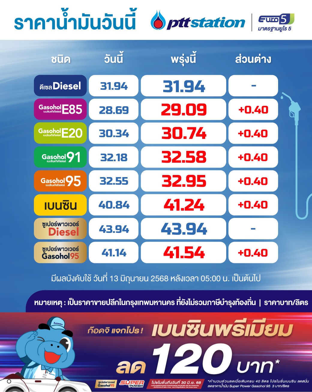 ปตท. ปรับขึ้นราคาน้ำมันกลุ่มเบนซิน ส่วนน้ำมันในกลุ่มดีเซลราคาคงเดิม มีผลวันที่ 13 มิ.ย. 68