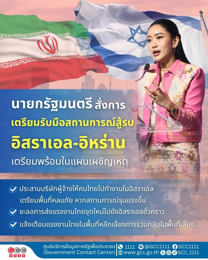 นายกรัฐมนตรี สั่งการเตรียมรับมือสถานการณ์สู้รบอิสราเอล-อิหร่าน ในทุกมิติ พร้อมให้เตรียมพร้อมในแผนเผชิญเหตุ ต้องดูแลคนไทยในพื้นที่เสี่ยงทุกสถานการณ์ให้เต็มที่ หลังรับรายงานยังไม่พบคนไทยได้รับอันตราย