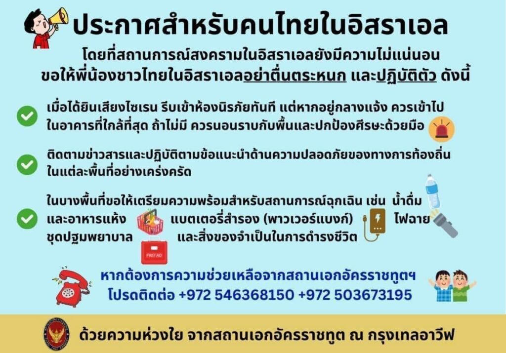 สถานเอกอัครราชทูต ณ กรุงเทลอาวีฟ ออกประกาศแจ้งเตือนคนไทยในอิสราเอล ให้เพิ่มความระมัดระวังและติดตามสถานการณ์ความไม่สงบอย่างใกล้ชิด โดยแนะนำให้ปฏิบัติตามคำแนะนำด้านความปลอดภัยของทางการท้องถิ่น และหากต้องการความช่วยเหลือ สามารถติดต่อสถานทูตได้ที่หมายเลขฉุกเฉินที่ โทรศัพท์: +972 546368150, +972 503673195