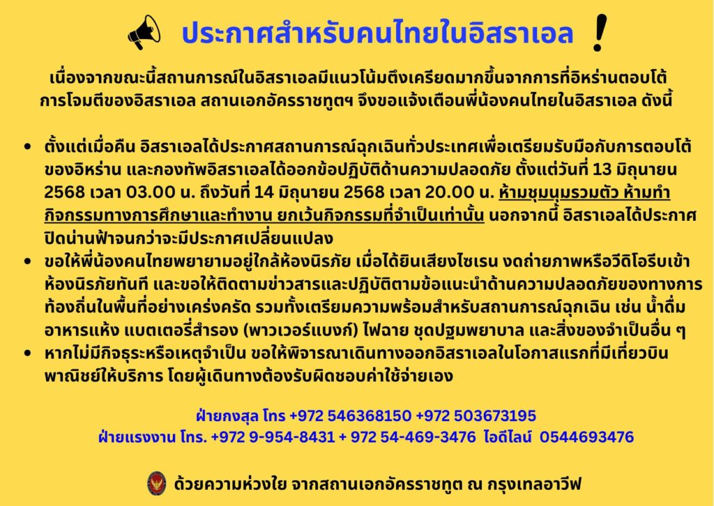 สถานทูต ณ กรุงเทลอาวีฟ เตือนคนไทยในอิสราเอลเพิ่มความระมัดระวัง พร้อมแนะนำการปฏิบัติด้านความปลอดภัย
