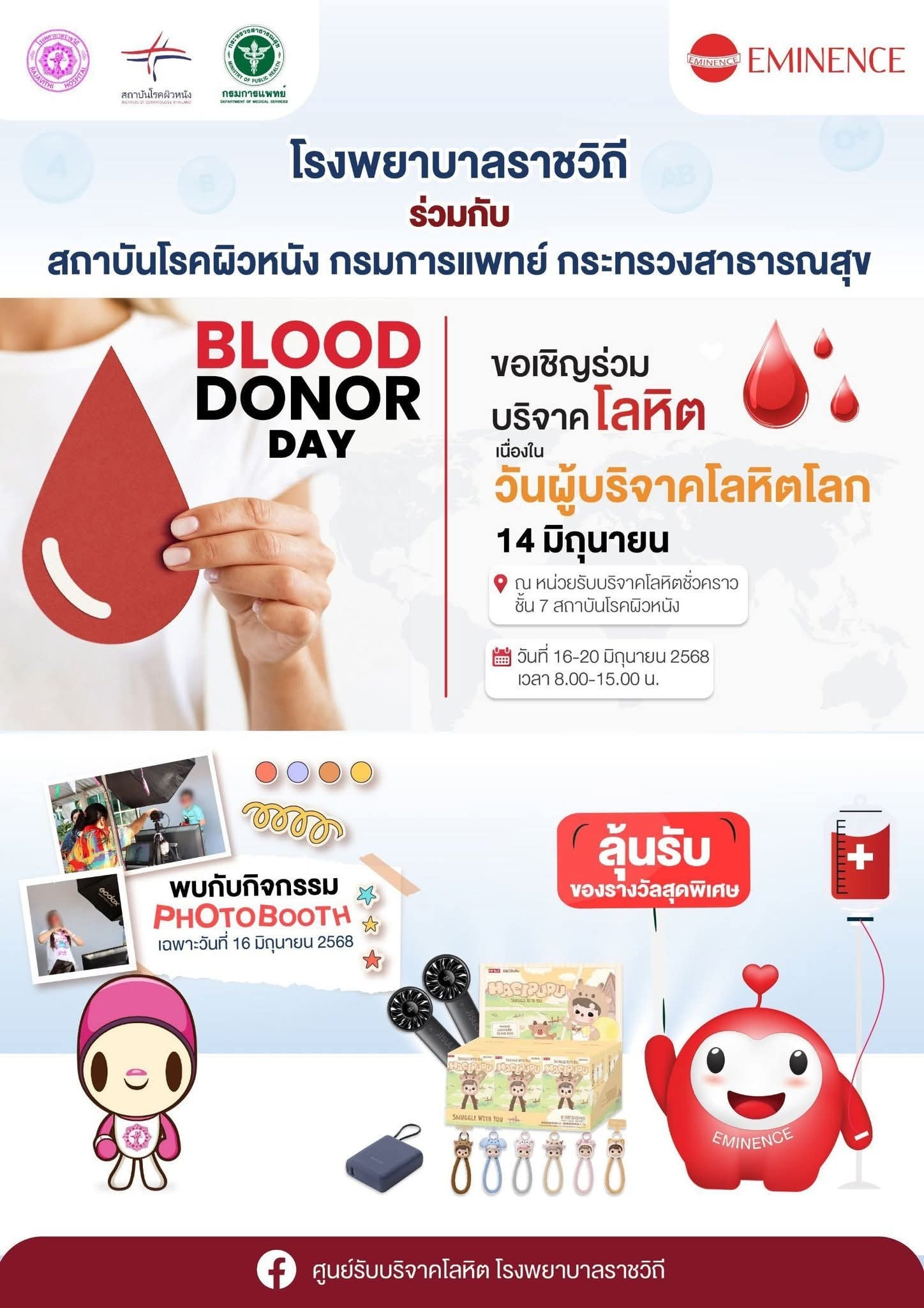 “เนื่องในวันที่ 14 มิถุนายน ของทุกปีเป็นวันผู้บริจาคโลหิตโลก” โรงพยาบาลราชวิถี ร่วมกับ สถาบันโรคผิวหนัง กรมการแพทย์ กระทรวงสาธารณสุข ขอเชิญชวนทุกท่านผู้มีสุขภาพดีร่วมเป็นส่วนหนึ่งของการให้ที่ยิ่งใหญ่ด้วยการบริจาคโลหิตกับกิจกรรมสัปดาห์วันผู้บริจาคโลหิต สามารถร่วมบริจาคโลหิตได้ระหว่างวันที่ 16 – 20 มิถุนายน 2568 เวลา 08.00 – 15.00 น. ณ หน่วยรับบริจาคโลหิตชั่วคราว สถาบันโรคผิวหนัง ชั้น 7 ลุ้นรับของที่ระลึก เช่น เสื้อยืด, pop mart (จำนวนจำกัด) แก้วน้ำและอื่น ๆ อีกมากมาย พิเศษสำหรับ วันที่ 16 มิถุนายน พบกับกิจกรรม Photo booth