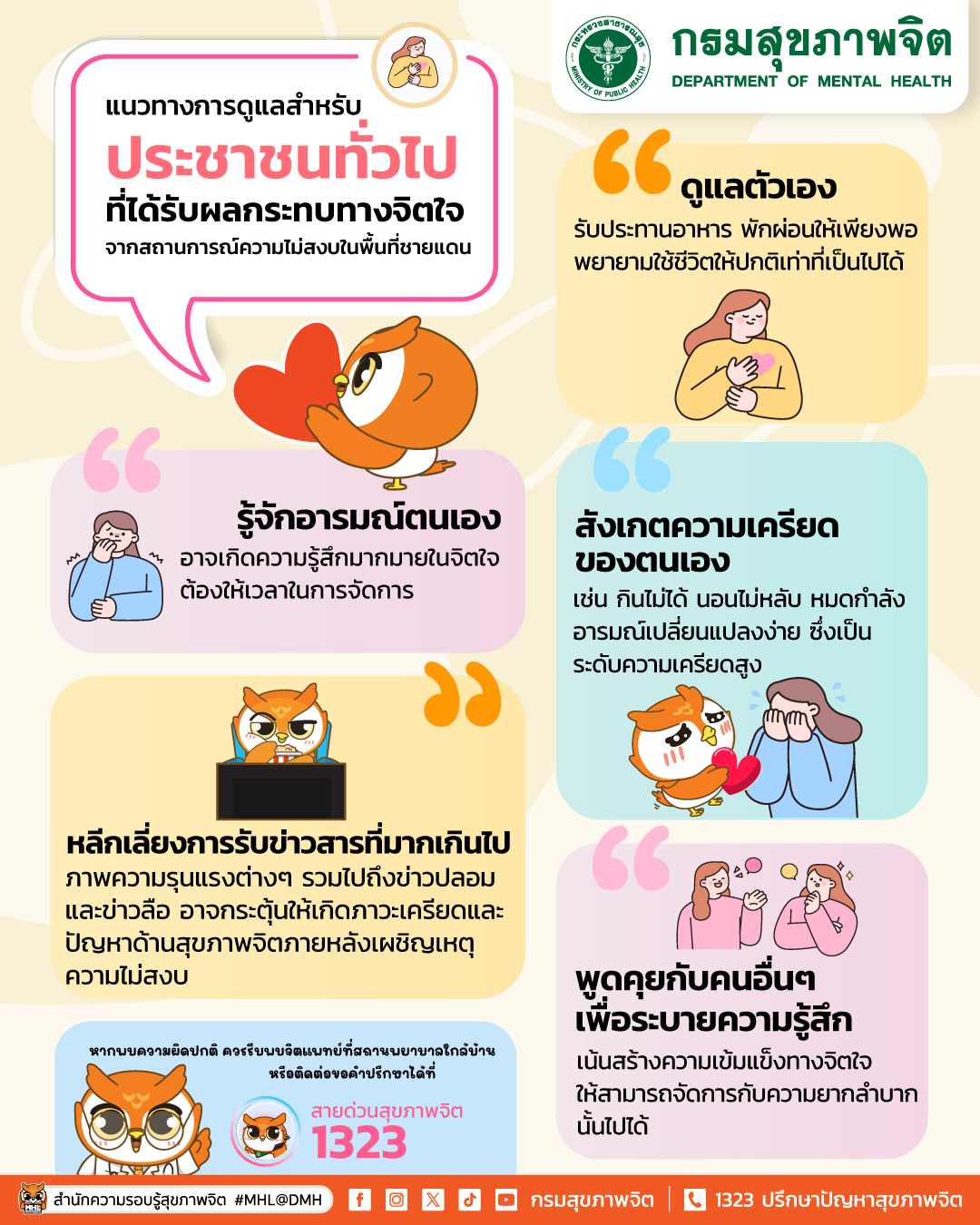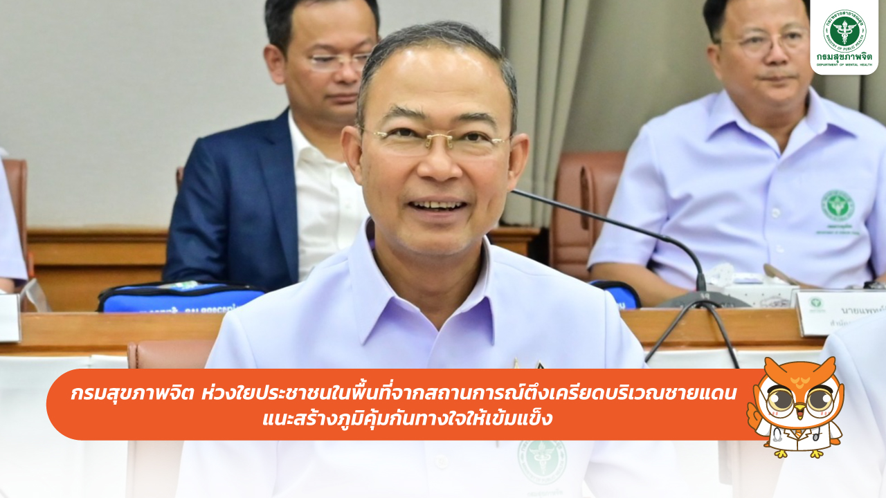 นายแพทย์กิตติศักดิ์ อักษรวงศ์ อธิบดีกรมสุขภาพจิต กล่าวว่า จากสถานการณ์ความตึงเครียดบริเวณพื้นที่ชายแดนที่กำลังเกิดขึ้น ส่งผลกระทบโดยตรงต่อสภาพจิตใจของประชาชนในเขตสุขภาพที่ 6, 9 และ 10 ซึ่งอาจทำให้เกิดความเครียด วิตกกังวล ความกลัว และความไม่แน่นอน ซึ่งเป็นปฏิกิริยาทางจิตใจที่เกิดขึ้นอย่างธรรมชาติเมื่อเผชิญกับเหตุการณ์ที่มีความเสี่ยงหรือความเปลี่ยนแปลงอย่างรวดเร็ว หากความเครียดเหล่านี้สะสมหรือดำเนินไปอย่างต่อเนื่อง อาจนำไปสู่ภาวะซึมเศร้า ภาวะหมดไฟ (burnout) ได้ ซึ่งส่งผลเสียต่อสุขภาพจิตและคุณภาพชีวิตโดยรวม กรมสุขภาพจิตจึงเน้นย้ำให้ประชาชนใส่ใจสังเกตอาการทางจิตใจของตนเองและสมาชิกในครอบครัว เช่น ความรู้สึกวิตกกังวลที่เพิ่มขึ้น อารมณ์ที่เปลี่ยนแปลงอย่างรวดเร็ว นอนไม่หลับ หรือรู้สึกหมดกำลังใจ การดูแลสุขภาพจิตอย่างมีประสิทธิภาพประกอบด้วยการใช้เทคนิคการผ่อนคลายจิตใจ เช่น การฝึกหายใจลึก ๆ การทำสมาธิ หรือการออกกำลังกายเบา ๆ นอกจากนี้ การพูดคุยแลกเปลี่ยนความรู้สึกกับคนใกล้ชิดยังช่วยลดความโดดเดี่ยวทางอารมณ์และเสริมสร้างระบบสนับสนุนทางสังคม ซึ่งเป็นแนวทางสำคัญในการสร้างภูมิคุ้มกันทางใจให้เข้มแข็ง รวมทั้งติดตามข่าวสารจากแหล่งที่เชื่อถือได้อย่างสม่ำเสมอ
