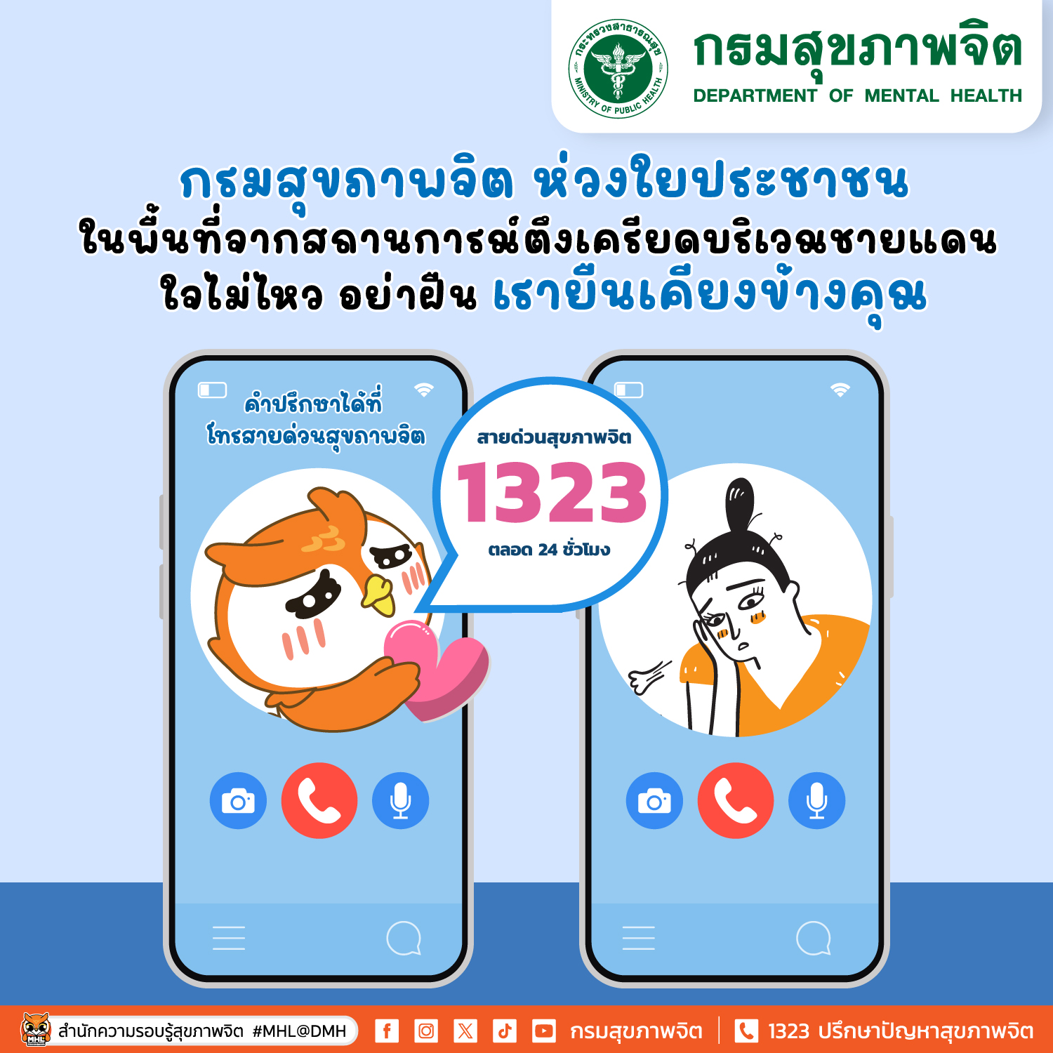 นายแพทย์กิตติศักดิ์ อักษรวงศ์ อธิบดีกรมสุขภาพจิต กล่าวต่อว่า กรมสุขภาพจิตได้ประสานความร่วมมือกับหน่วยงานสาธารณสุข โรงพยาบาล และศูนย์สุขภาพจิตในพื้นที่ เพื่อเตรียมความพร้อมทั้งด้านบุคลากรและทรัพยากรในการให้บริการดูแลสุขภาพจิตแก่ผู้ที่ได้รับผลกระทบอย่างทั่วถึงและรวดเร็ว นอกจากนี้ ประชาชนสามารถติดต่อรับคำปรึกษาและความช่วยเหลือได้ผ่านสายด่วนสุขภาพจิต 1323 ตลอด 24 ชั่วโมง ทั้งนี้ การดูแลสุขภาพจิตในช่วงเวลาวิกฤตนับเป็นสิ่งจำเป็นที่ควรได้รับความสำคัญไม่ยิ่งหย่อนไปกว่าการดูแลสุขภาพกาย เพื่อป้องกันปัญหาสุขภาพจิตในระยะยาวและเสริมสร้างความมั่นคงของชุมชน กรมสุขภาพจิต ขอเชิญชวนประชาชนร่วมกันสร้างบรรยากาศแห่งความสงบสุข หลีกเลี่ยงการเผยแพร่ข้อมูลที่ยังไม่ได้รับการยืนยันหรืออาจก่อให้เกิดความตื่นตระหนก รวมถึงส่งเสริมความเข้าใจ ความอดทน และความสามัคคีในสังคม เพื่อเสริมสร้างความเข้มแข็งทางใจให้กับตนเอง ครอบครัว และชุมชน โดยกรมสุขภาพจิตจะติดตามสถานการณ์อย่างใกล้ชิด พร้อมดำเนินมาตรการสนับสนุนอย่างเต็มกำลัง เพื่อให้ประชาชนสามารถผ่านพ้นสถานการณ์ที่ท้าทายนี้ไปได้อย่างปลอดภัย มั่นคง และยั่งยืน