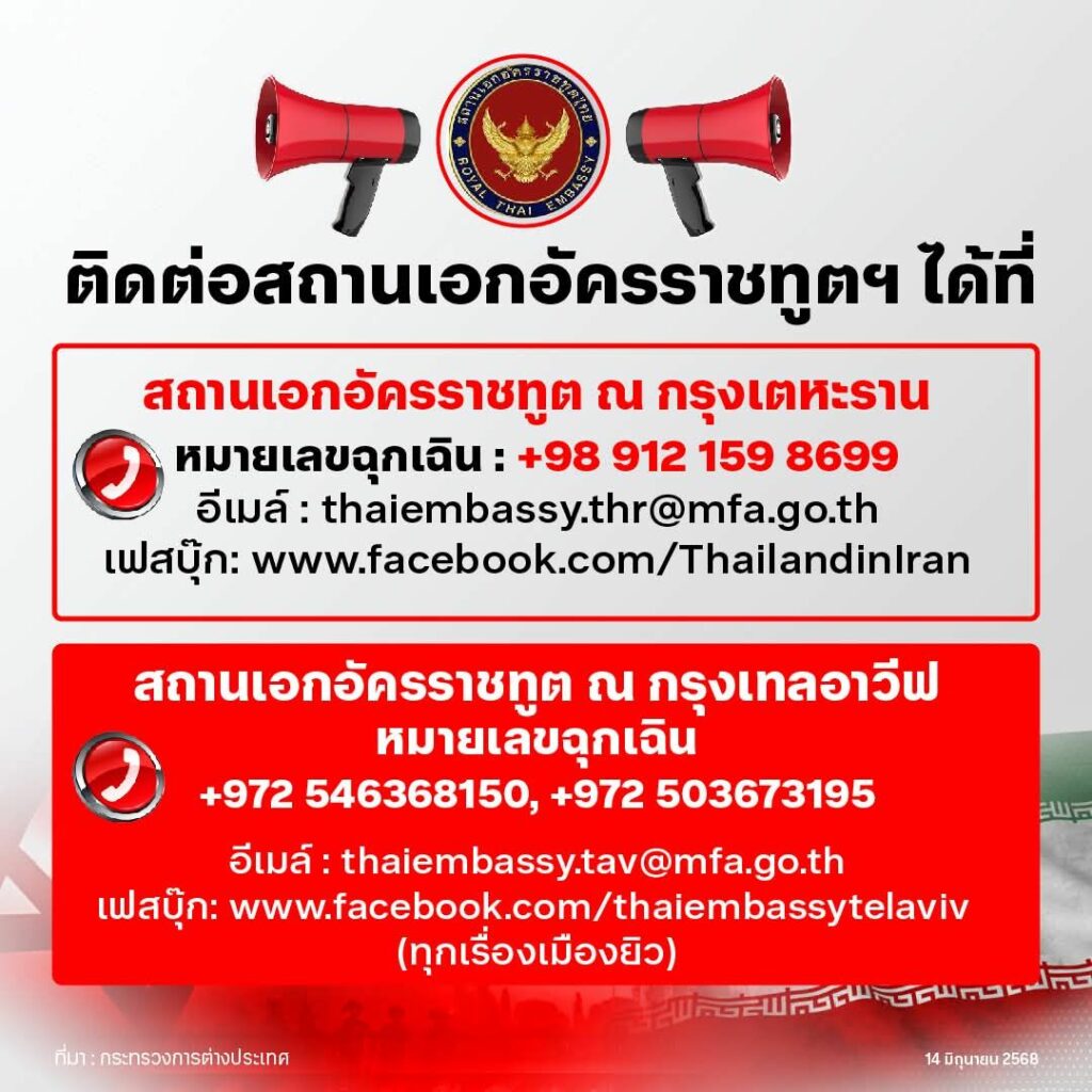 สถานเอกอัครราชทูตฯ ขอให้คนไทยในอิหร่าน-อิสราเอล ติดตามข่าวสารฯ อย่างใกล้ชิดและต่อเนื่อง