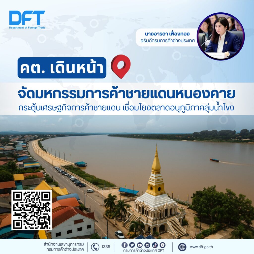 กรมการค้าต่างประเทศ ขอเชิญชวนผู้ประกอบการที่สนใจ สมัครเข้าร่วมกิจกรรมภายในงานมหกรรมการค้าชายแดน ณ จังหวัดหนองคาย ระหว่างวันที่ 3 – 8 กรกฎาคม 2568 เพื่อสัมผัสโอกาสทางการค้าและการลงทุนในพื้นที่ศักยภาพสูงแห่งลุ่มแม่น้ำโขง ทั้งนี้ ผู้ที่สนใจเข้าร่วมงานฯ สามารถติดตามรายละเอียดเพิ่มเติมได้ที่ www.dft.go.th , Facebook: กรมการค้าต่างประเทศ DFT และสายด่วน 1385 DFT Call Center