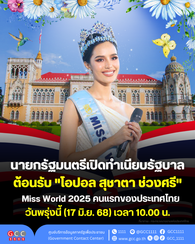 รัฐบาล เตรียมต้อนรับ Miss World 2025 คนแรกของประเทศไทย ณ ทำเนียบรัฐบาล วันพรุ่งนี้ (17 มิ.ย. 68)
