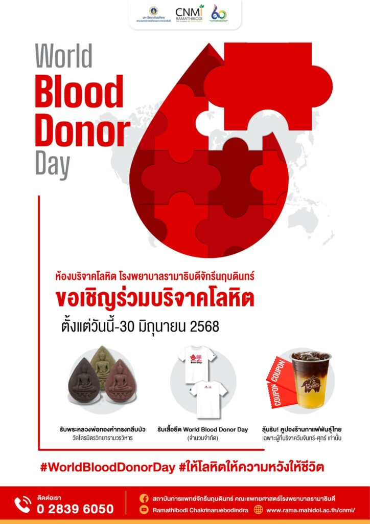 สถาบันการแพทย์จักรีนฤบดินทร์ คณะแพทยศาสตร์โรงพยาบาลรามาธิบดี ขอเชิญร่วมบริจาคโลหิต เนื่องในวัน World Blood Donor Day ตั้งแต่บัดนี้ – 30 มิถุนายน 2568 ณ ห้องบริจาคโลหิต โรงพยาบาลรามาธิบดีจักรีนฤบดินทร์