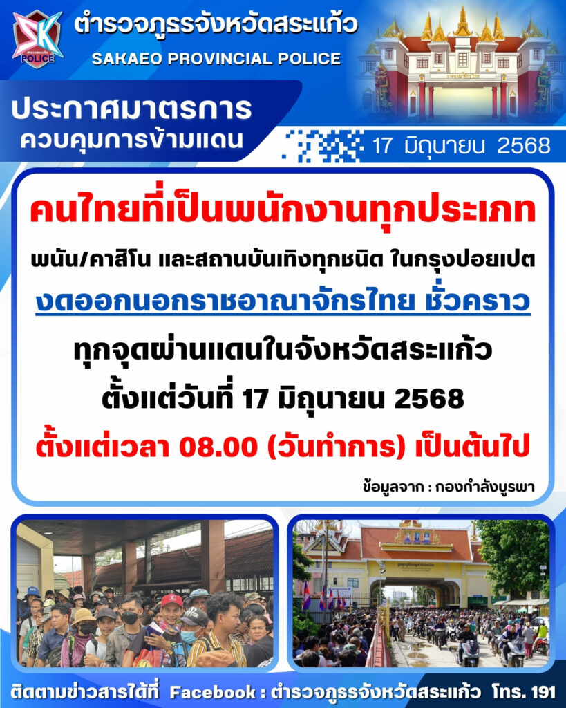 จังหวัดสระแก้ว สั่งคนไทยที่ทำงานสถานบันเทิงฝั่งปอยเปต งดออกนอกราชอาจักรไทย เริ่ม 17 มิ.ย. 68
