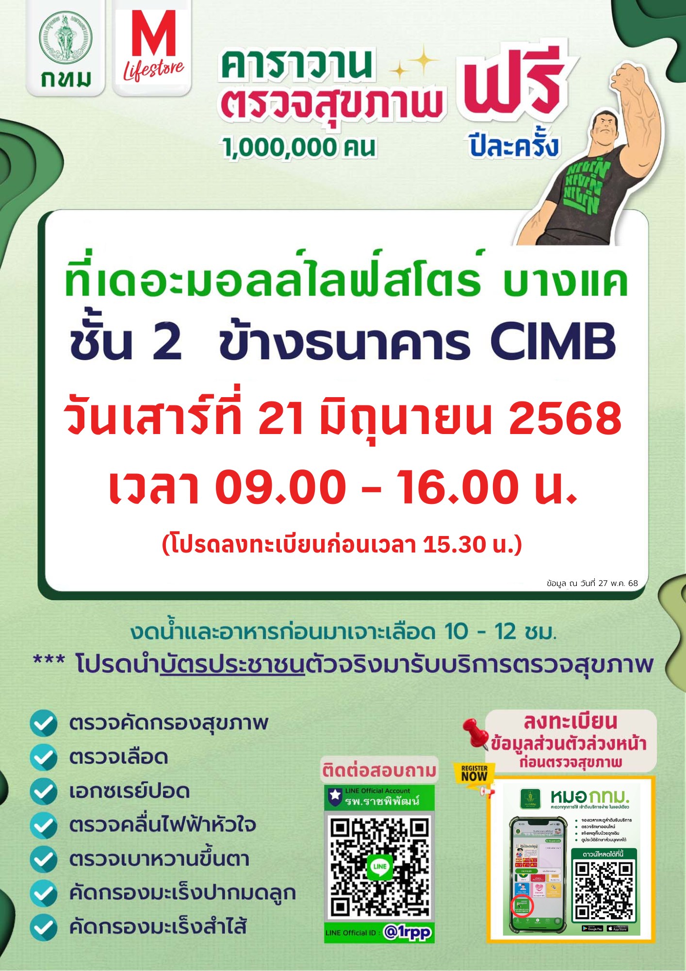 โรงพยาบาลราชพิพัฒน์ จัดคาราวานตรวจสุขภาพล้านคน ฟรี ปีละครั้ง วันเสาร์ที่ 21 มิถุนายน 2568 เวลา 09.00 – 16.00 น. ณ เดอะมอลล์ไลฟ์สโตร บางแค ชั้น 2 ข้างธนาคาร CIMB