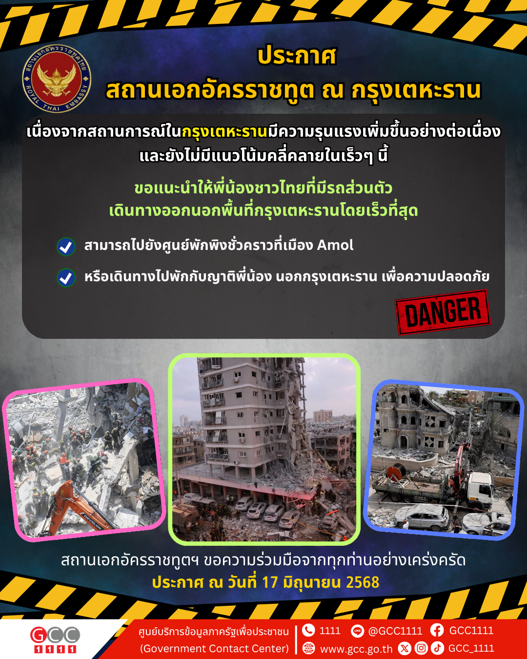 สถานเอกอัครราชทูต ณ กรุงเตหะราน ประกาศสถานการณ์ภายในกรุงเตหะรานทวีความรุนแรงเพิ่มขึ้นเรื่อยๆ และยังไม่มีแนวโน้มในระยะใกล้ที่จะกลับมาเป็นปกติพี่น้องชาวไทยทุกท่านที่มีรถโดยสารส่วนตัว ขอแนะนำให้เดินทางออกนอกพื้นที่กรุงเตหะรานในโอกาสแรกโดยสามารถเดินทางไปที่ ศูนย์พักพิงชั่วคราวเมือง Amol หรือเดินทางไปพักกับญาติพี่น้องนอกกรุงเตหะรานก่อน เพื่อความปลอดภัย