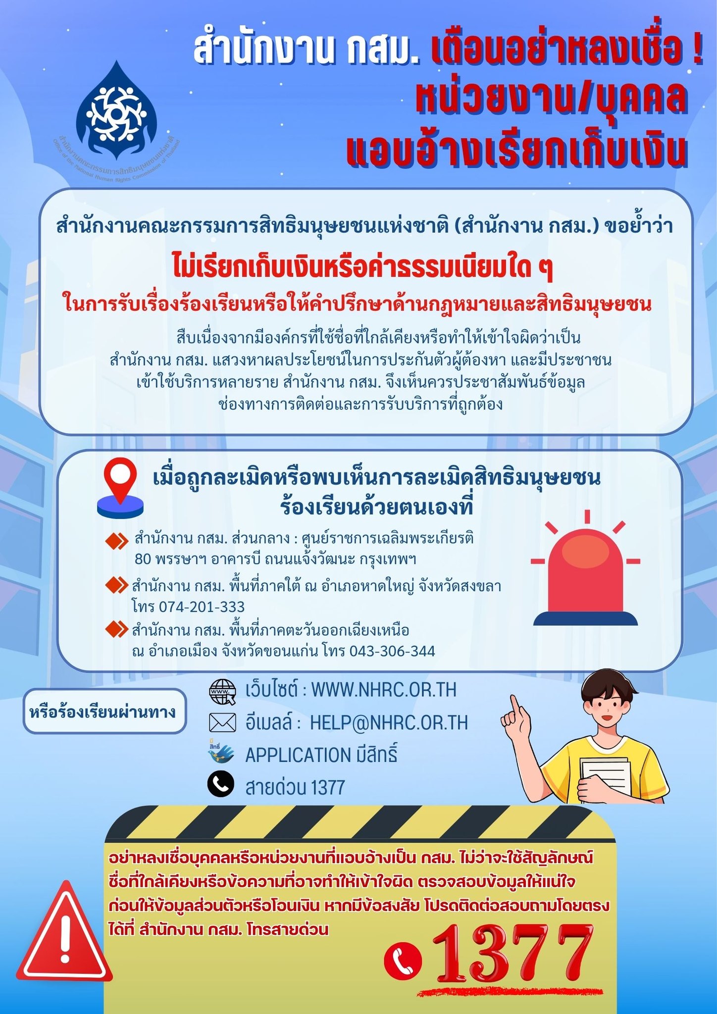 ทั้งนี้ ขอเน้นย้ำว่า สำนักงาน กสม. ไม่เรียกเก็บเงิน หรือค่าธรรมเนียมใด ๆ จากผู้ร้องเรียนหรือขอคำปรึกษาด้านกฎหมายและสิทธิมนุษยชน