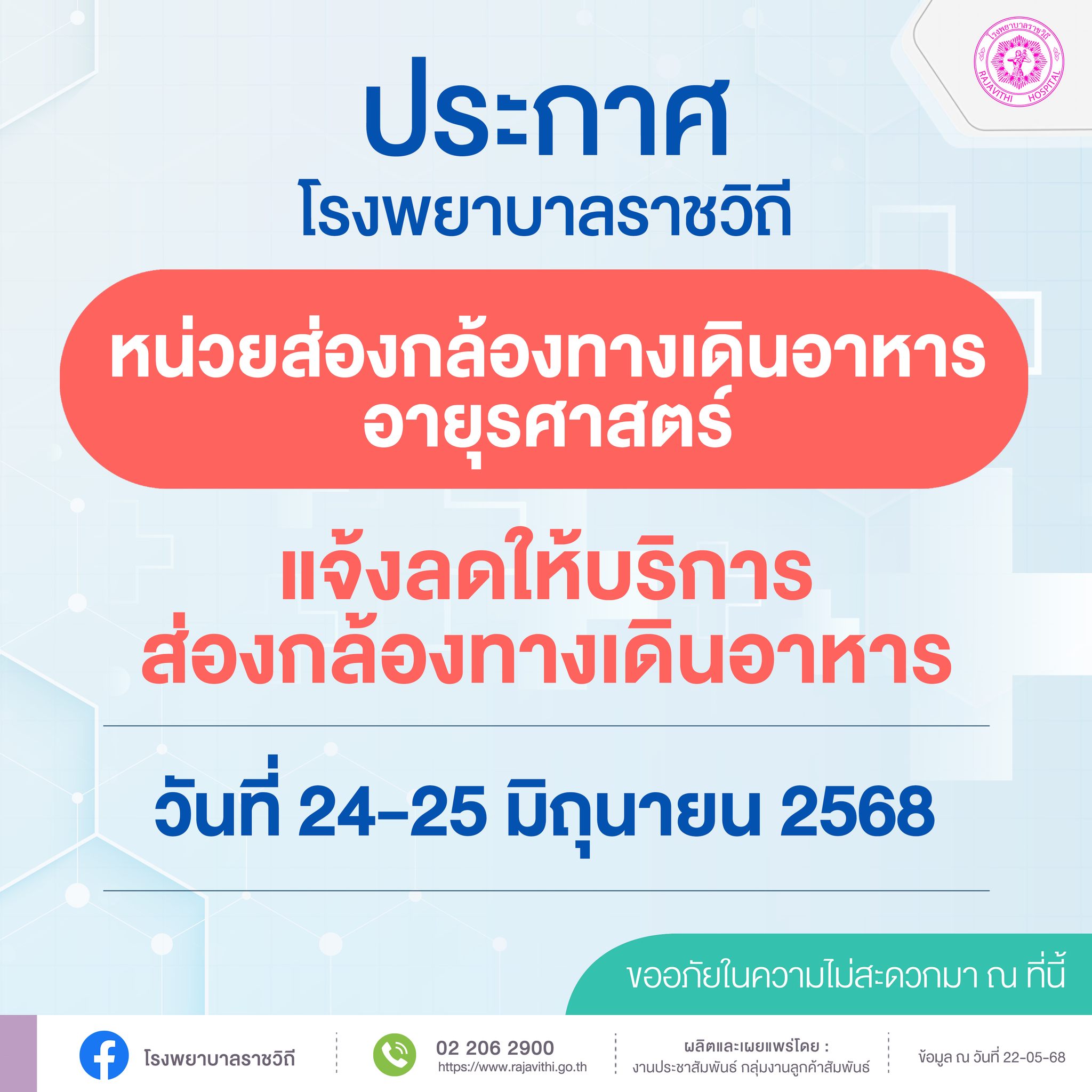 โรงพยาบาลราชวิถี ลดให้บริการส่องกล้องทางเดินอาหาร วันที่ 24 – 25 มิถุนายน 2568