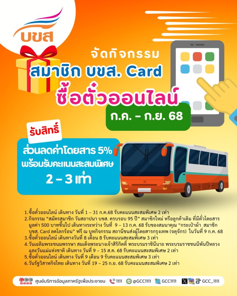 โดย กิจกรรม “สมาชิก บขส. Card’” เดือนกรกฎาคม – กันยายน 2568 จะได้รับสิทธิ์ส่วนลดค่าโดยสาร 5% พร้อมรับคะแนนสะสมพิเศษ 2 – 3 เท่า ดังนี้