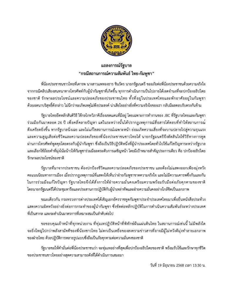 แถลงการณ์รัฐบาล “กรณีสถานการณ์ความสัมพันธ์ ไทย – กัมพูชา”