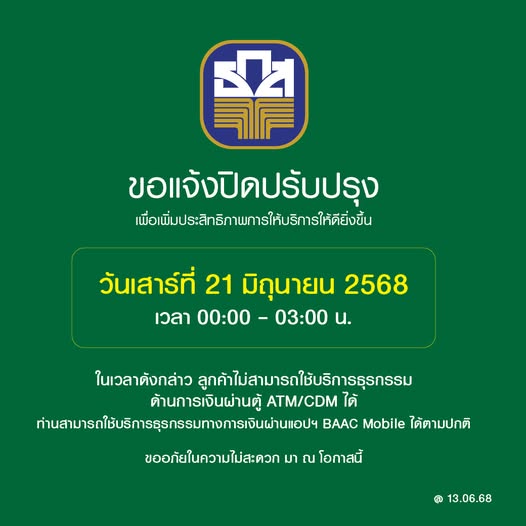 ธนาคารเพื่อการเกษตรและสหกรณ์การเกษตร แจ้งปิดปรับปรุงระบบเพื่อเพิ่มประสิทธิภาพการให้บริการให้ดียิ่งขึ้น วันที่ 21 มิถุนายน 2568 เวลา 00.00 – 03.00 น. ในเวลาดังกล่าว ไม่สามารถฝากเงินสดไปบัญชีต่างธนาคารผ่านเครื่องรับฝากเงินอัตโนมัติ (CDM) ได้ สำหรับบริการธุรกรรมทางการเงินผ่านแอปพลิเคชัน BAAC Mobile สามารถใช้งานได้ตามปกติ