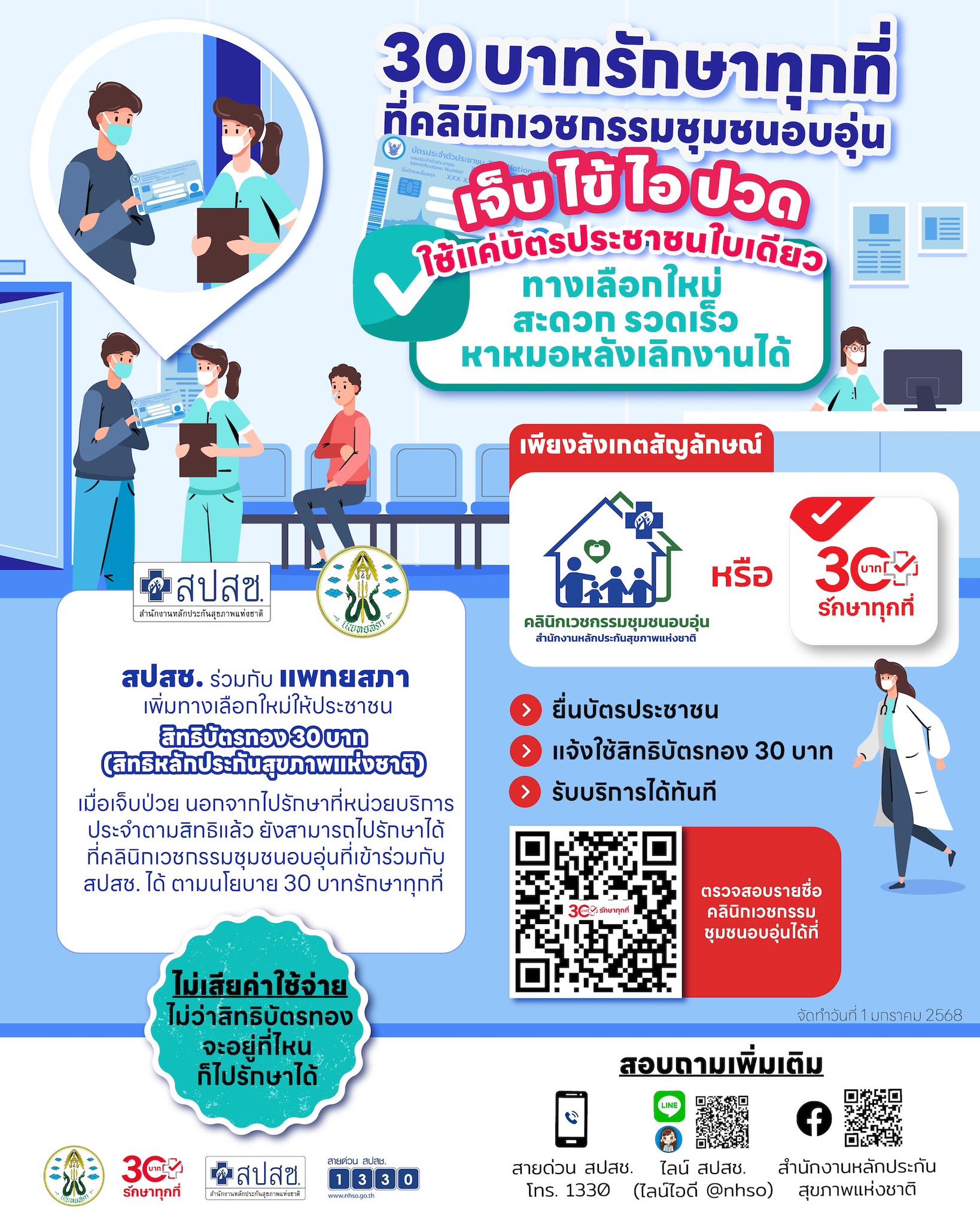 ตรวจสอบรายชื่อคลินิกเวชกรรมชุมชนอบอุ่น ที่สามารถใช้สิทธิ 30 บาทรักษาทุกที่ https://media.nhso.go.th/30plus/map_responsive.php