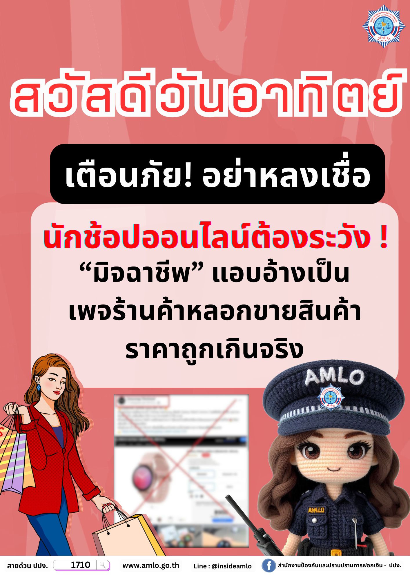 สำนักงานป้องกันและปราบปรามการฟอกเงิน แจ้งเตือนภัย อย่าหลงเชื่อนักช้อปออนไลน์ต้องระวัง นักช้อปออนไลน์ต้องระวัง มิจฉาชีพ แอบอ้างเป็น เพจร้านค้าหลอกขายสินค้า ราคาถูกเกินจริง