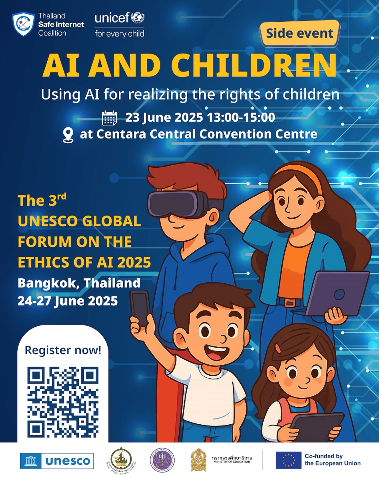 UNICEF และ Thailand Safe Internet Coalition ขอเชิญคุณร่วมกิจกรรมเสวนากับเวที AI and Children: Using AI for realizing the rights of children กิจกรรม Side Event ภายใต้การประชุม The 3rd UNESCO Global Forum on the Ethics of AI 2025 สุดเข้มข้นที่ทุกภาคส่วนต้องไม่พลาด