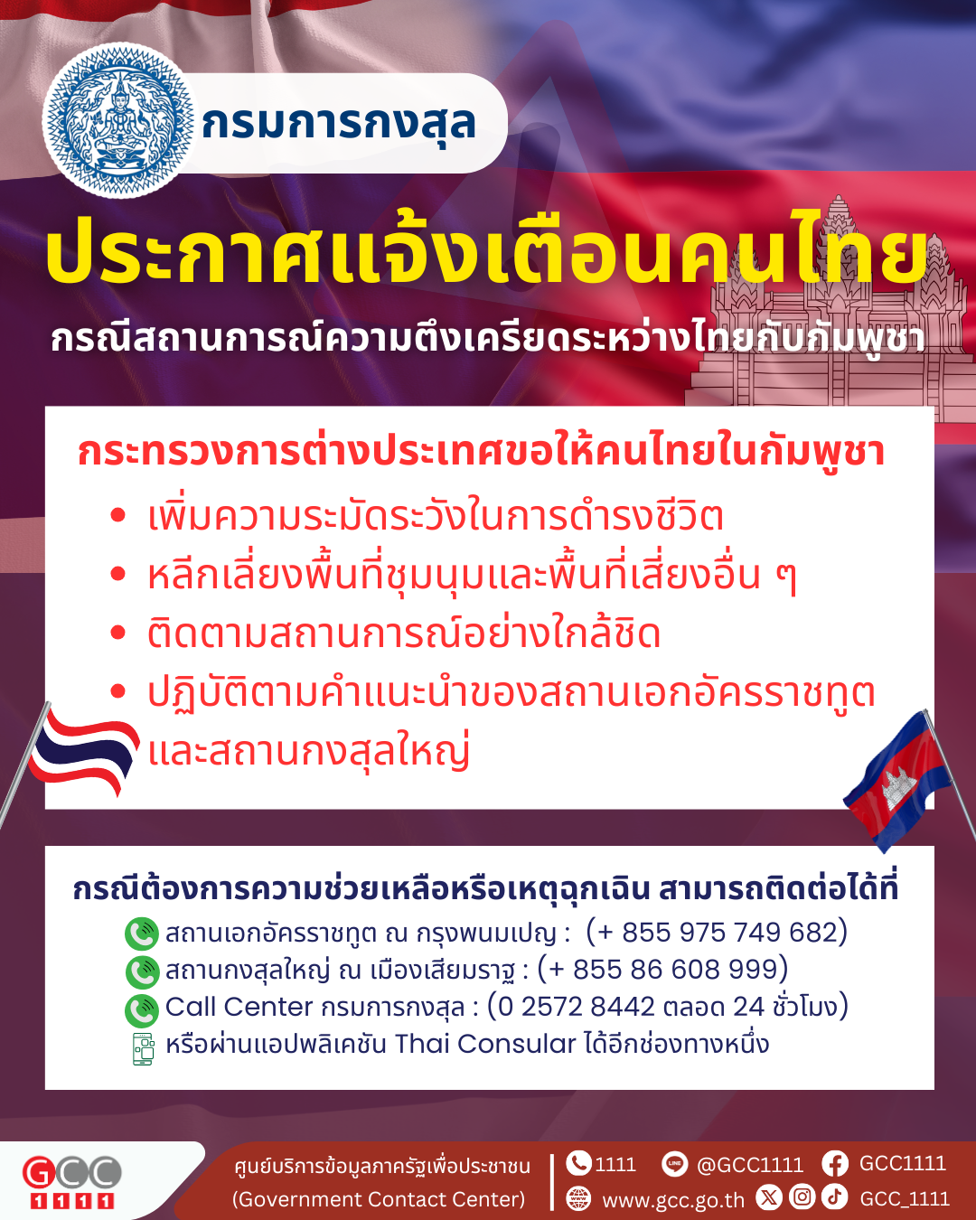 ตามที่เกิดสถานการณ์ความตึงเครียดระหว่างไทยกับกัมพูชา กระทรวงการต่างประเทศขอให้คนไทยที่อยู่ในกัมพูชาขอให้เพิ่มความระมัดระวังในการดำรงชีวิตและหลีกเลี่ยงการเข้าใกล้พื้นที่ชุมนุมและพื้นที่เสี่ยงอื่น ๆ รวมทั้งติดตามสถานการณ์อย่างใกล้ชิด และปฏิบัติตามคำแนะนำของสถานเอกอัครราชทูต/สถานกงสุลใหญ่