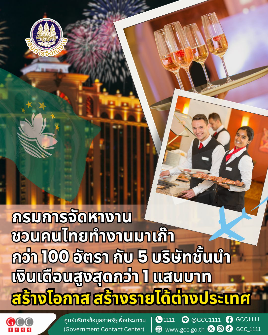 กรมการจัดหางาน ชวนคนไทยทำงานมาเก๊า กว่า 100 อัตรา กับ 5 บริษัทชั้นนำ สร้างโอกาส สร้างรายได้ต่างประเทศ