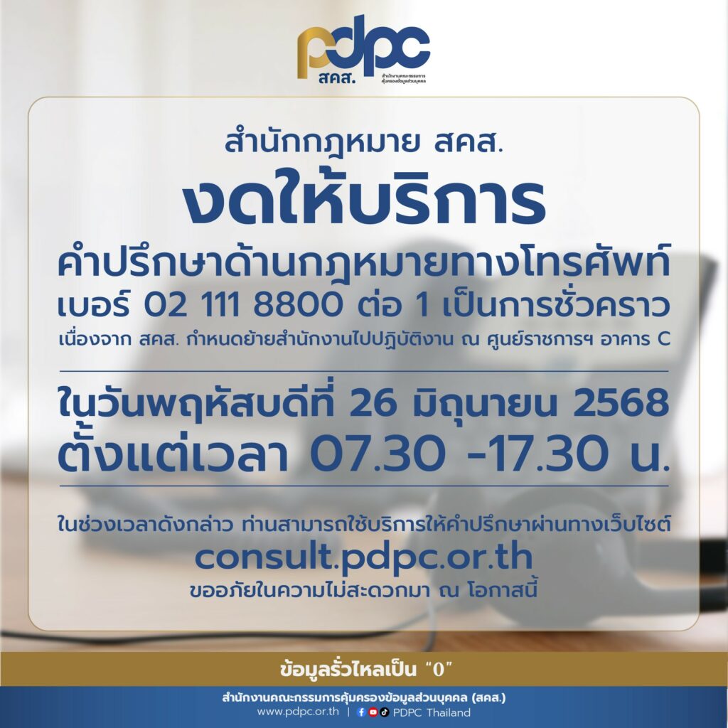 สำนักงานคณะกรรมการคุ้มครองข้อมูลส่วนบุคคล (สคส.) ขอแจ้งให้ทราบว่า ในวันพฤหัสบดีที่ 26 มิถุนายน 2568 ทางสำนักกฎหมาย สคส. ของดการให้บริการให้คำปรึกษาด้านกฎหมายผ่านช่องทางโทรศัพท์ หมายเลข 0 2111 8800 ต่อ 1 เนื่องจากมีการย้ายสำนักงานไปยังอาคาร C ศูนย์ราชการเฉลิมพระเกียรติ แจ้งวัฒนะ