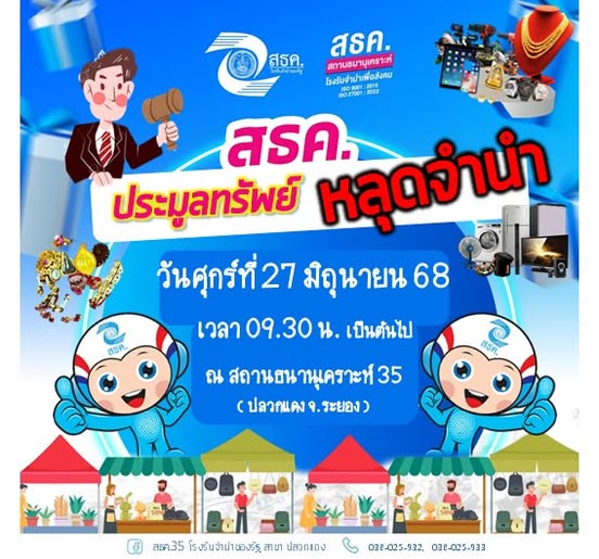สถานธนานุเคราะห์ 35 ปลวกแดง จังหวัวระยอง ขอเชิญร่วมประมูลทรัพย์หลุดจำนำ ราคาถูก สินค้าคุณภาพ ในวันศุกร์ที่ 27 มิถุนายน 2568 ตั้งแต่เวลา 09.30 น. เป็นต้นไป ณ สถานธนานุเคราะห์ 35 ปลวกแดง จังหวัดระยอง