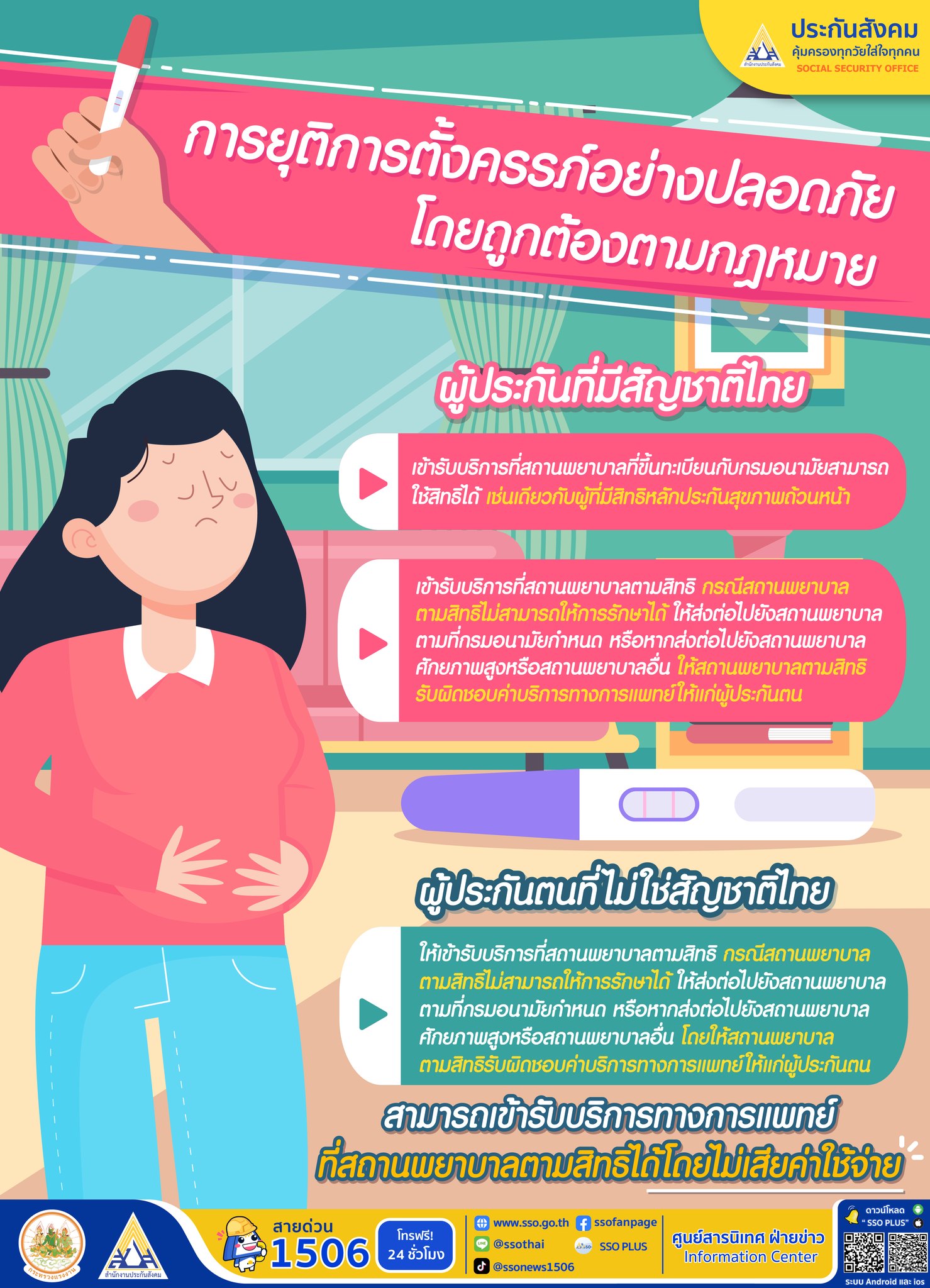 สำนักงานประกันสังคม ให้สิทธิผู้ประกันตนหญิงที่ท้องไม่พร้อม สามารถเข้ารับบริการยุติการตั้งครรภ์ที่ปลอดภัยในสถานพยาบาลตามสิทธิได้โดยไม่เสียค่าใช้จ่าย ภายใต้หลักเกณฑ์ของแพทยสภา หากจำเป็นต้องส่งต่อไปยังสถานพยาบาลอื่น ค่ารักษายังคงอยู่ในความรับผิดชอบของสถานพยาบาลตามสิทธิ ทั้งนี้ ผู้ประกันตนที่มีสัญชาติไทยสามารถใช้สิทธิได้ทั้งในระบบประกันสังคมและหลักประกันสุขภาพถ้วนหน้า ส่วนผู้ที่ไม่มีสัญชาติไทยใช้สิทธิผ่านสถานพยาบาลตามสิทธิประกันสังคมเช่นกัน