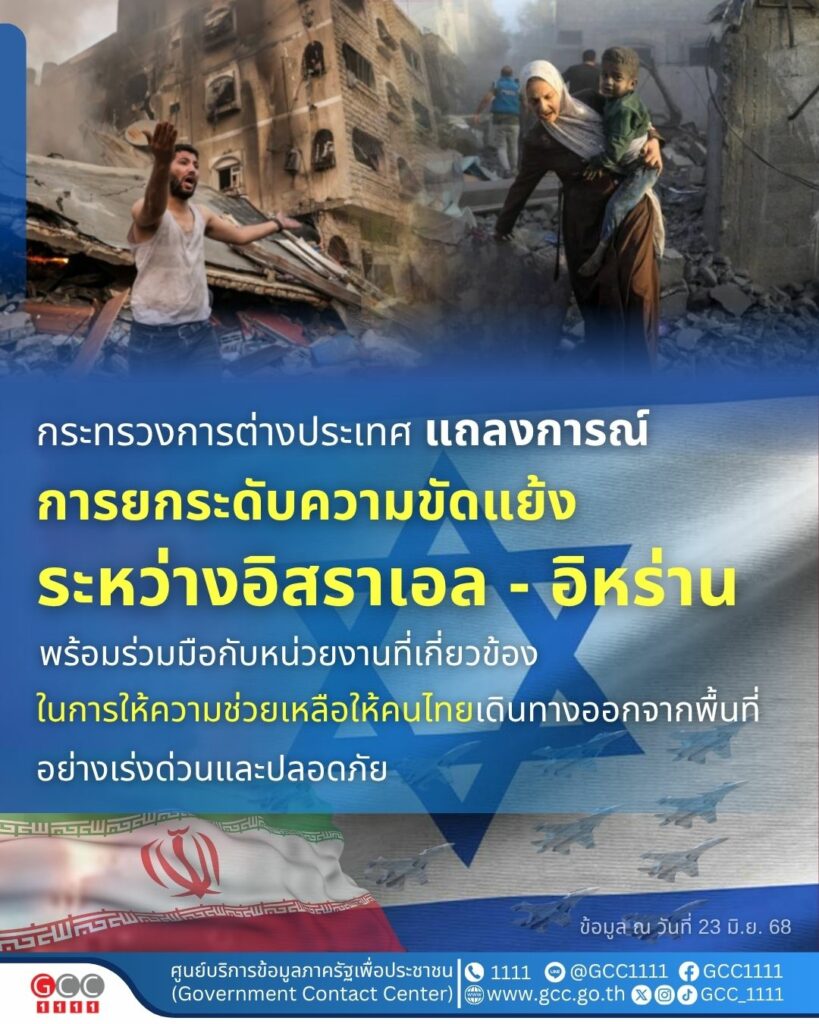 กระทรวงการต่างประเทศ แถลงการณ์เรื่องการยกระดับความขัดแย้งระหว่างอิสราเอลกับอิหร่าน ทั้งนี้ได้ร่วมมือกับหน่วยงานที่เกี่ยวข้องอย่างแข็งขัน ภายใต้ศูนย์ประสานงานสถานการณ์ฉุกเฉิน (Rapid Response Center: RRC) ในการให้ความช่วยเหลือให้คนไทยเดินทางออกจากพื้นที่ที่ได้รับผลกระทบอย่างเร่งด่วนและปลอดภัย