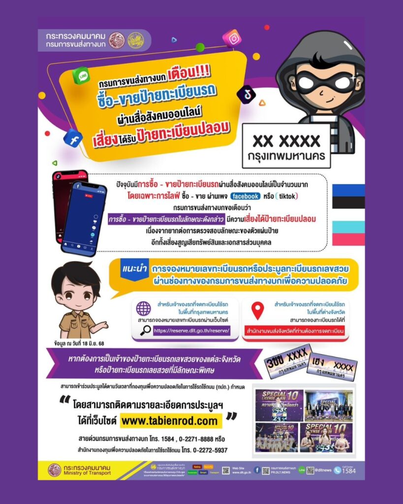 กรมการขนส่งทางบก แจ้งเตือน การซื้อ-ขายป้ายทะเบียนรถผ่านสื่อสังคมออนไลน์ เสี่ยงได้รับป้ายทะเบียนปลอม ปัจจุบันมีการซื้อ – ขายป้ายทะเบียนรถผ่านสื่อสังคมออนไลน์เป็นจำนวนมาก โดยเฉพาะการไลฟ์ซื้อ – ขายผ่านเพจ Facebook หรือ Tiktok ซึ่งมีความเสี่ยงได้ป้ายทะเบียนปลอมเนื่องจากยากต่อการตรวจสอบลักษณะของตัวแผ่นป้าย อีกทั้งเสี่ยงสูญเสียทรัพย์สินและเอกสารส่วนบุคคล สำหรับเจ้าของรถที่จดทะเบียนในพื้นที่กรุงเทพมหานครสามารถจองหมายเลขทะเบียนรถผ่านเว็บไซต์ https://reserve.dlt.go.th/reserve/ ซึ่งมีความสะดวก รวดเร็ว มีระบบการยืนยันตัวตนผ่านแอปฯ ThaID เพื่อความปลอดภัย และสำหรับเจ้าของรถที่จดทะเบียนใช้รถในพื้นที่ต่างจังหวัดสามารถจองทะเบียนรถได้ที่สำนักงานขนส่งจังหวัดที่ท่านต้องการจดทะเบียน