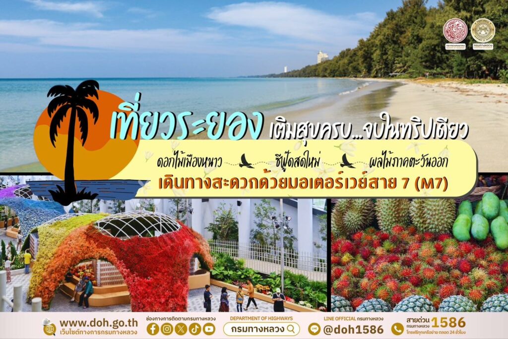 กรมทางหลวง ชวนเที่ยวระยอง “ดอกไม้เมืองหนาว ซีฟู๊ดสดใหม่ ผลไม้ภาคตะวันออก” ด้วยเส้นทางมอเตอร์เวย์สาย 7 ชวนชมนิทรรศการดอกไม้เมืองหนาว “Wondrous Bloom” และผ่อนคลายกับหาดทราย ท้องทะเล พร้อมเติมพลังด้วยเมนูเด็ดจากอาหารทะเลสดใหม่ และผลไม้ภาคตะวันออกอย่างทุเรียน มังคุด เงาะ ลองกอง สละ กระท้อน อื่นๆ