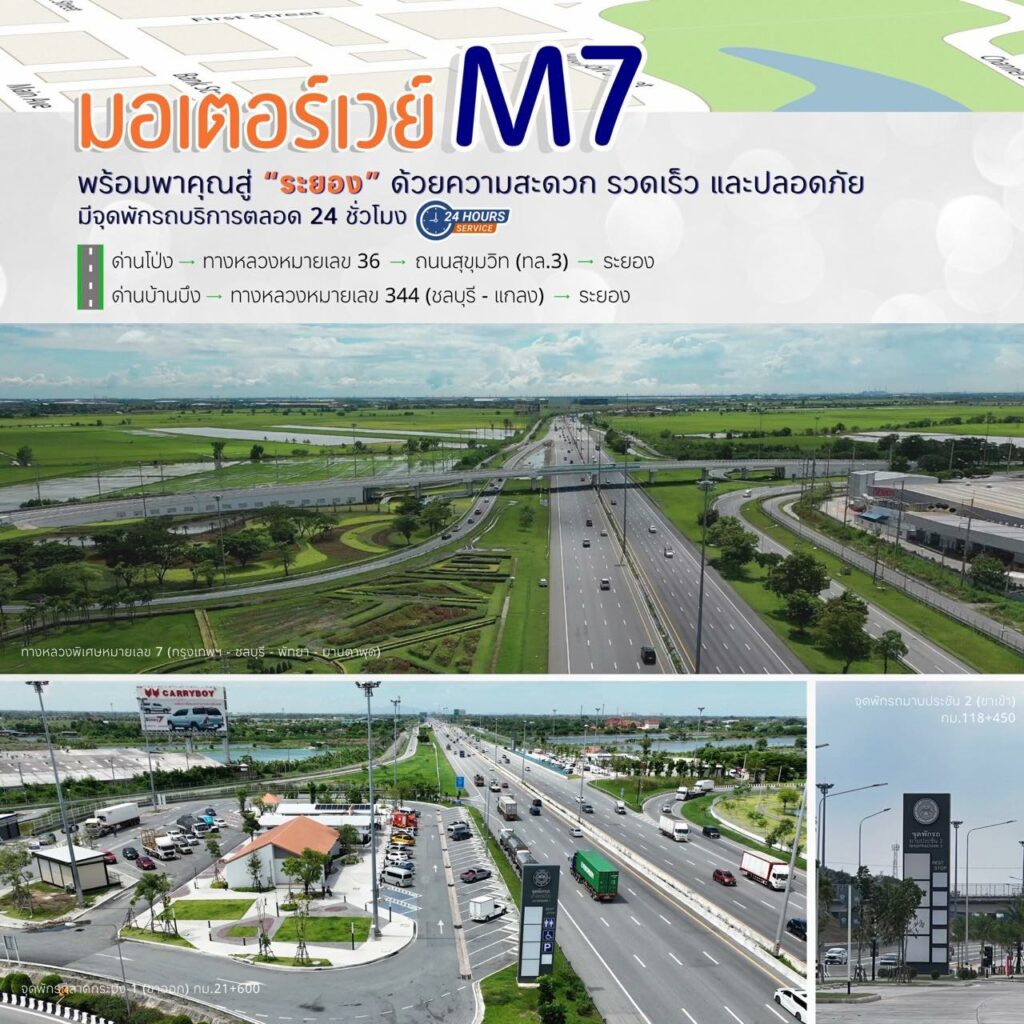 การเดินทางสู่ความสุข ณ จังหวัดระยอง แบบง่ายๆ ด้วยมอเตอร์เวย์สาย 7 (กรุงเทพฯ – ชลบุรี – พัทยา – มาบตาพุด) เส้นทางที่เชื่อมต่อระหว่างกรุงเทพฯ สู่ภาคตะวันออกได้อย่างสะดวก รวดเร็ว และปลอดภัย พร้อมจุดพักรถให้บริการตลอด 24 ชั่วโมง ผู้ใช้ทางสามารถเลือกออกที่