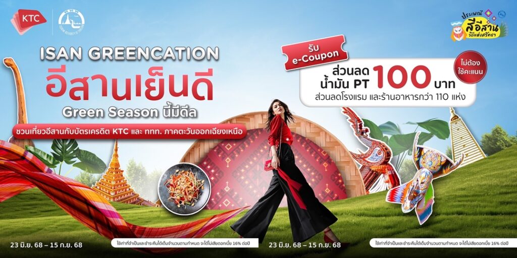 การท่องเที่ยวแห่งประเทศไทย (ททท.) ภูมิภาคภาคตะวันออกเฉียงเหนือ ร่วมกับ เคทีซี หรือ บริษัท บัตรกรุงไทย จำกัด (มหาชน) ตอกย้ำจุดยืนผู้นำด้านไลฟ์สไตล์การเดินทาง เปิดตัวแคมเปญ “Isan Greencation” อีสานเย็นดี Green Season นี้มีดีล สร้างกระแสการเดินทางท่องเที่ยวภาคอีสานรับ Green Season ส่งมอบประสบการณ์ท่องเที่ยวเหนือระดับด้วยโปรโมชั่นสุดพิเศษ หวังดึงนักเดินทางรุ่นใหม่สัมผัสเสน่ห์ไทย “วัฒนธรรม-ธรรมชาติ” ส่งมอบประสบการณ์ที่คุ้มค่าและมีความหมาย กระตุ้นการใช้จ่ายเพื่อกระจายรายได้สู่ชุมชนอย่างยั่งยืน