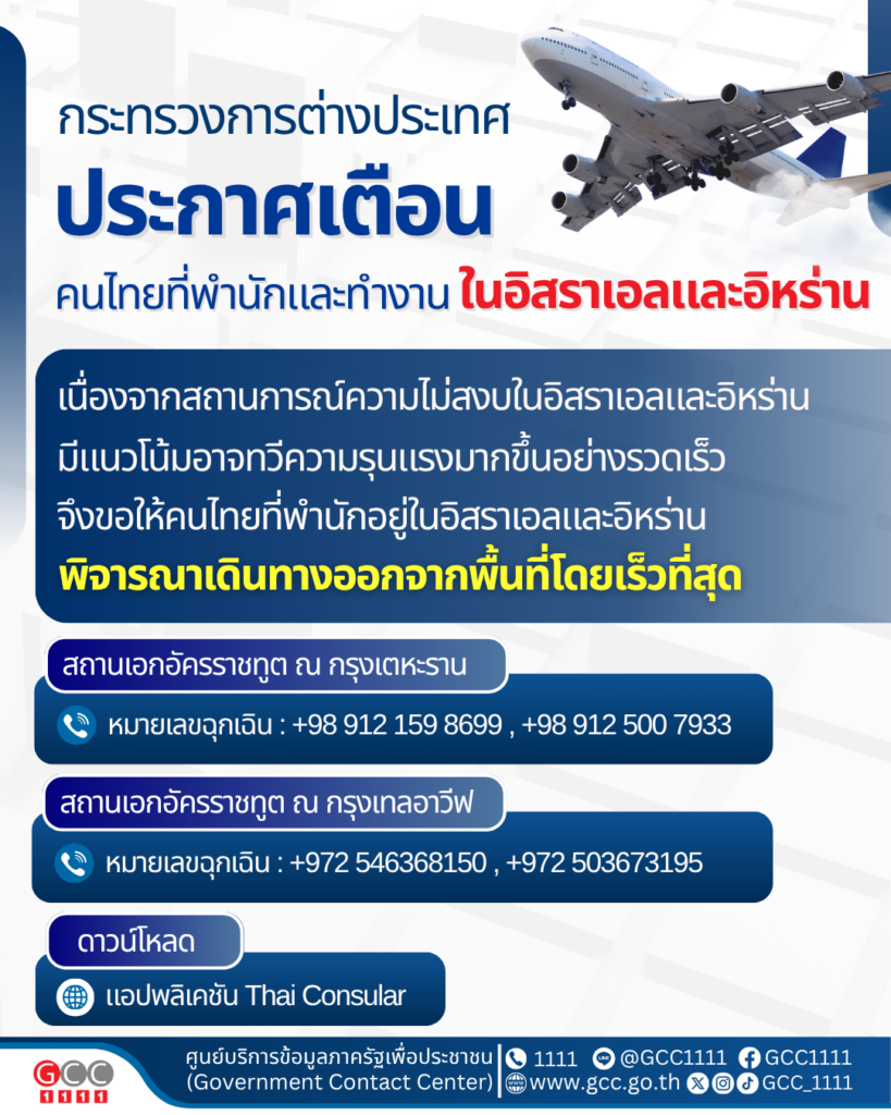 เนื่องจากสถานการณ์ความไม่สงบในอิสราเอลและอิหร่านมีแนวโน้มอาจทวีความรุนแรงมากขึ้นอย่างรวดเร็ว จึงขอให้คนไทยที่พำนักอยู่ในอิสราเอลและอิหร่านพิจารณาเดินทางออกจากพื้นที่โดยเร็วที่สุด
