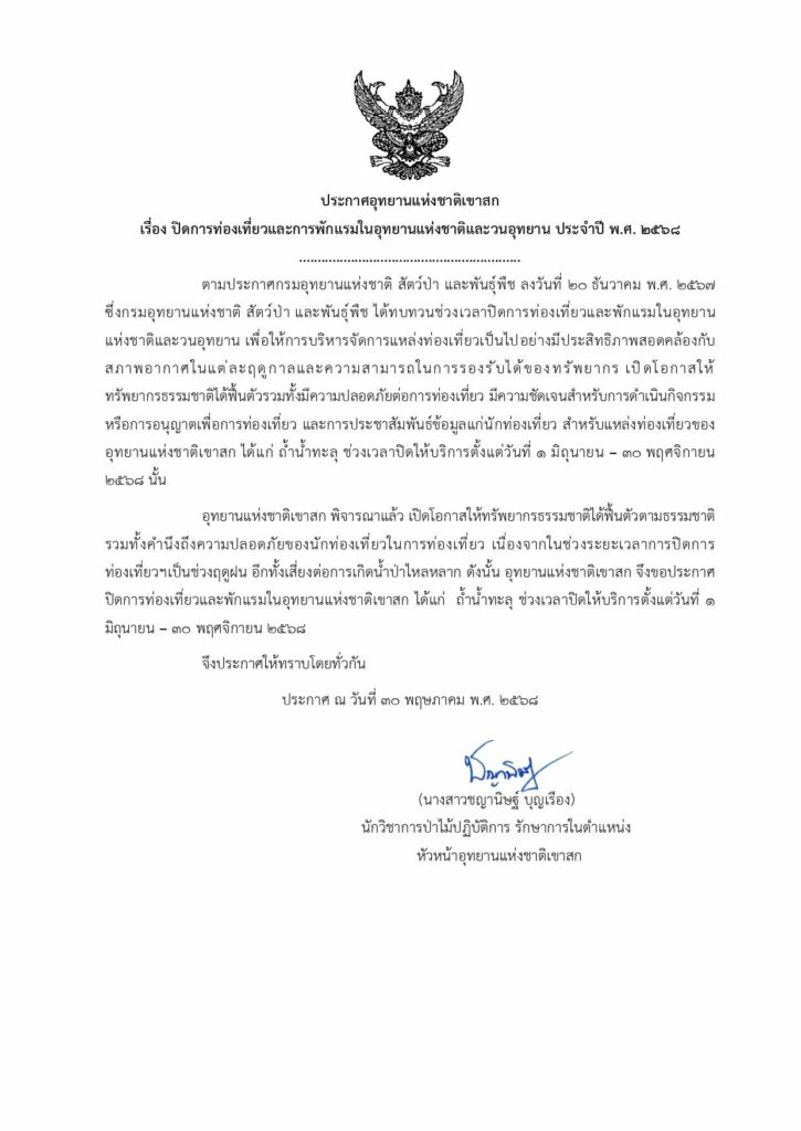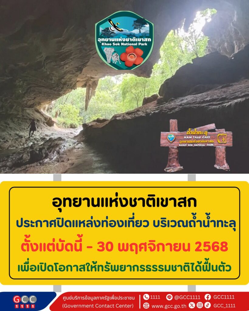 อุทยานแห่งชาติเขาสก ประกาศปิดแหล่งท่องเที่ยวประจำปีของอุทยานแห่งชาติเขาสก บริเวณถ้ำน้ำทะลุ ตั้งแต่วันที่ 1 มิถุนายน 2568 – 30 พฤศจิกายน 2568