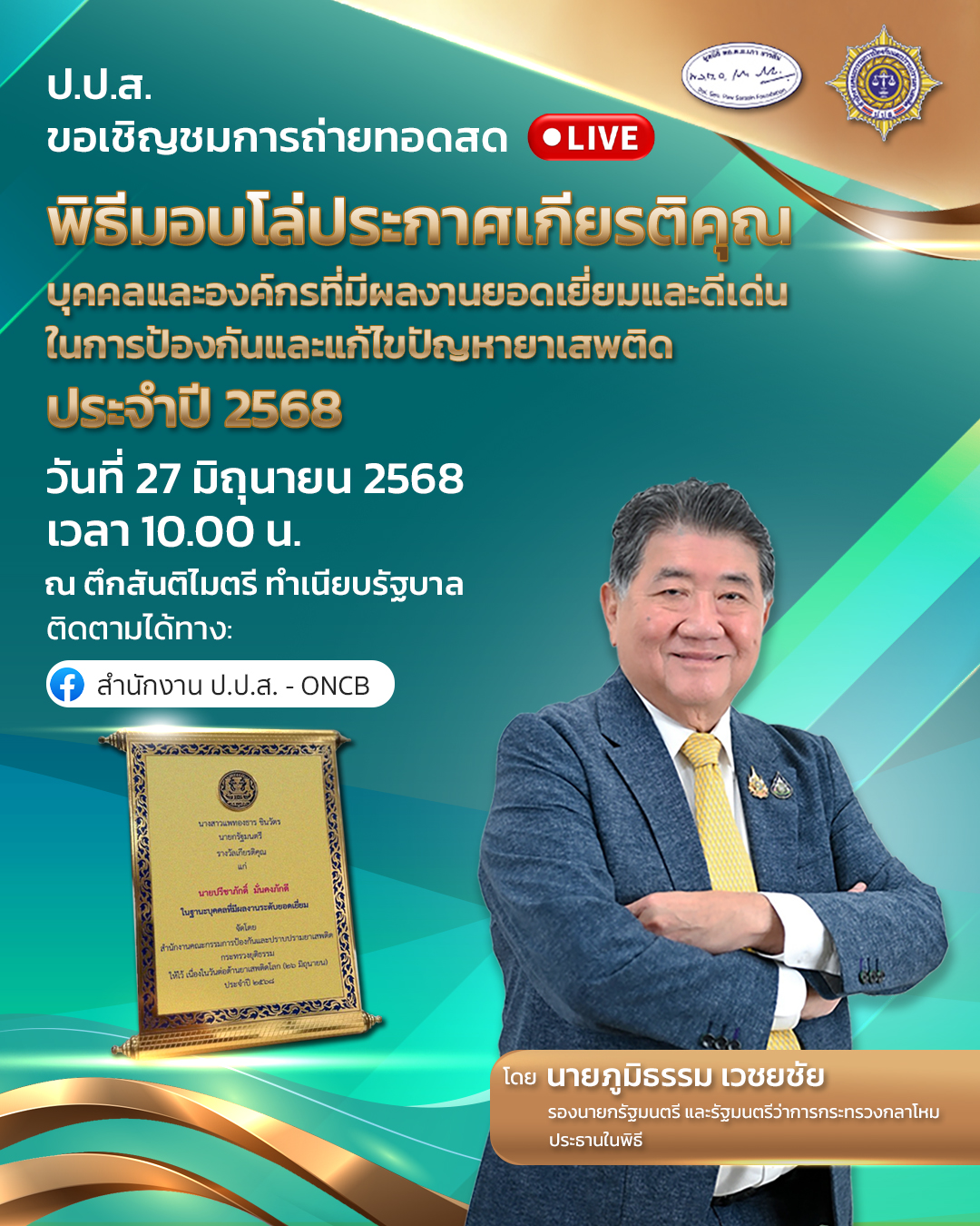 สำนักงาน ป.ป.ส. ขอเชิญชมการถ่ายทอดสดพิธีมอบโล่ประกาศเกียรติคุณบุคคลและองค์กร