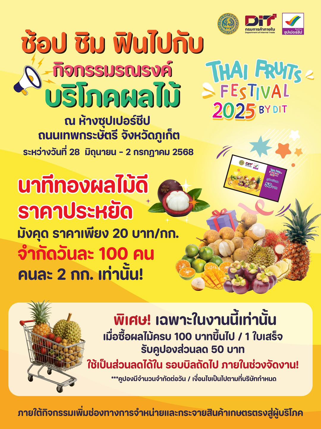 ช้อป ชิม ฟินไปกับ กิจกรรมรณรงค์บริโภคผลไม้ ณ ห้างซุปเปอร์ซีป ถนนเทพกระษัตรี จังหวัดภูเก็ต ระหว่างวันที่ 28 มิถุนายน – 2 กรกฎาคม 2568