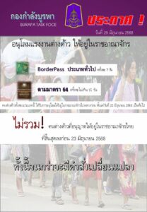 กรณีคนต่างด้าว ซึ่งได้รับอนุญาตให้เข้ามาในราชอาณาจักรไทยตามมาตรา 13(2) แห่งพระราชบัญญัติคนเข้าเมือง พุทธศักราช 2522 โดยเป็นผู้ถือหนังสือผ่านแดน BorderPass ประเภททั่วไป ที่ได้รับอนุญาต ครั้งละ 7 วัน และประเภทแรงงานต่างด้าวที่ได้รับอนุญาตให้ทำงานชั่วคราวในราชอาณาจักรไทย ตามมาตรา 64 แห่งพระราชกำหนดการบริหารจัดการการทำงานของคนต่างด้าวพุทธศักราช 2560 และที่แก้ไขเพิ่มเติม ประกอบหนังสือความตกลงระหว่างรัฐบาล แห่งราชอาณาจักรไทยกับรัฐบาลแห่งราชอาณาจักรกัมพูชา ว่าด้วยการข้ามแดนระหว่างประเทศทั้งสอง ลงวันที่ 11 กรกฎาคม 2558 ข้อ 7 (2) โดยได้รับอนุญาตให้อยู่ในราชการอาณาจักรครั้งละไม่เกิน 15 วัน ซึ่งคนต่างด้าวทั้งสองประเภทนี้ ได้รับการอนุโลมให้อยู่ในราชอาณาจักรไปพลางก่อน ตั้งแต่วันที่ 23 มิถุนายน 2568 เป็นต้นไป สำหรับการอนุโลมนี้ ไม่รวมถึงคนต่างด้าว ที่อนุญาตให้อยู่ในราชอาณาจักรไทย สิ้นสุดลงก่อน 23 มิถุนายน 2568 จนกว่าจะมีคำสั่งเปลี่ยนแปลง