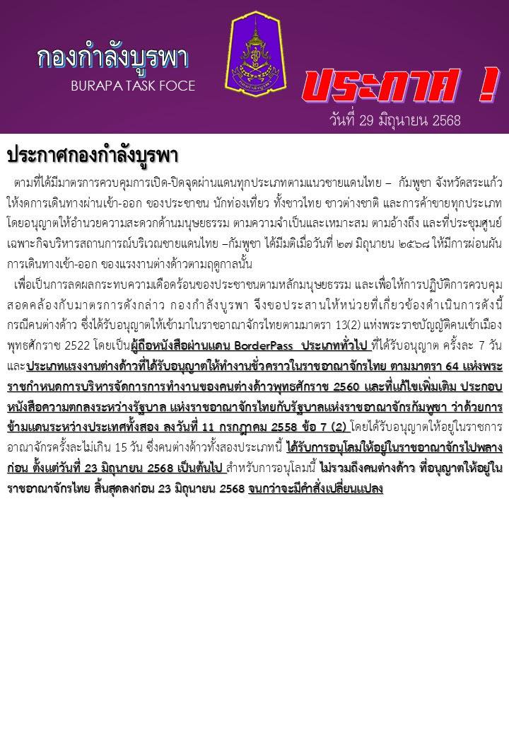 ตามที่ได้มีมาตรการควบคุมการเปิด-ปิดจุดผ่านแดนทุกประเภทตามแนวชายแดนไทย – กัมพูชา จังหวัดสระแก้ว ให้งดการเดินทางผ่านเข้า-ออก ของประชาชน นักท่องเที่ยว ทั้งชาวไทย ชาวต่างชาติ และการค้าขายทุกประเภท โดยอนุญาตให้อำนวยความสะดวกด้านมนุษยธรรม ตามความจำเป็นและเหมาะสม ตามอ้างถึง และที่ประชุมศูนย์เฉพาะกิจบริหารสถานการณ์บริเวณชายแดนไทย –กัมพูชา ได้มีมติเมื่อวันที่ 27 มิถุนายน 2568 ให้มีการผ่อนผันการเดินทางเข้า-ออก ของแรงงานต่างด้าวตามฤดูกาลนั้น
