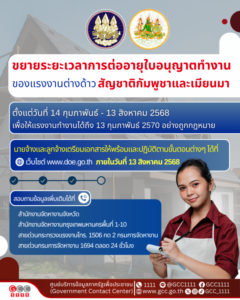 กรมการจัดหางาน ขยายระยะเวลาการต่ออายุใบอนุญาตทำงานของแรงงานต่างด้าวสัญชาติกัมพูชาและเมียนมา เป็นระยะเวลา 6 เดือน ตั้งแต่วันที่ 14 กุมภาพันธ์ 2568 ถึง 13 สิงหาคม 2568