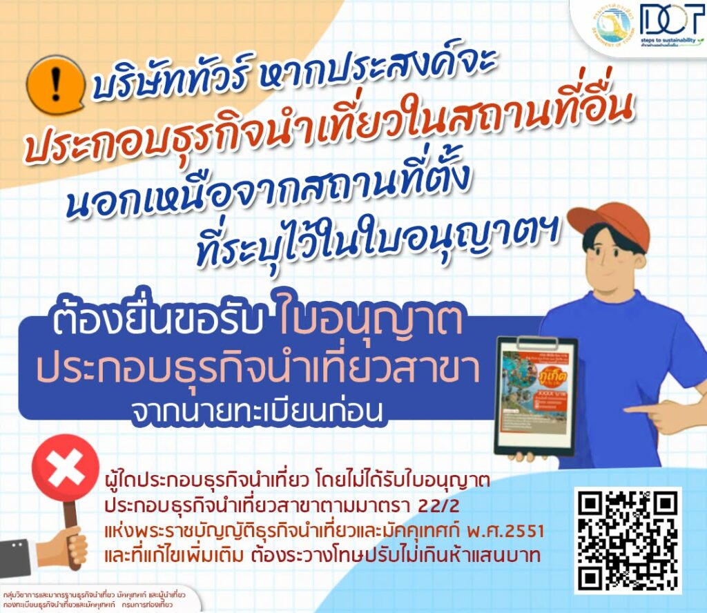 กรมการท่องเที่ยว เปิดเผย บริษัททัวร์ หากประสงค์จะประกอบธุรกิจนำเที่ยวในสถานที่อื่น นอกเหนือจากสถานที่ตั้งที่ระบุไว้ในใบอนุญาตฯ ต้องยื่นขอรับใบอนุญาตประกอบธุรกิจนำเที่ยวสาขา จากนายทะเบียนก่อน