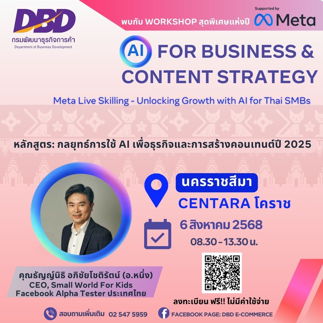 กรมพัฒนาธุรกิจการค้า จัดการอบรมเชิงปฏิบัติการ กลยุทธ์การใช้ AI เพื่อธุรกิจและการสร้างคอนเทนต์ ปี 2025 วันที่ 6 สิงหาคม 2568 ณ เซ็นทารา โคราช จังหวัดนครราชสีมา ผู้ที่สนใจสามารถลงทะเบียนตั้งแต่วันนี้ – 25 กรกฎาคม 2568 ได้ที่ คลิก