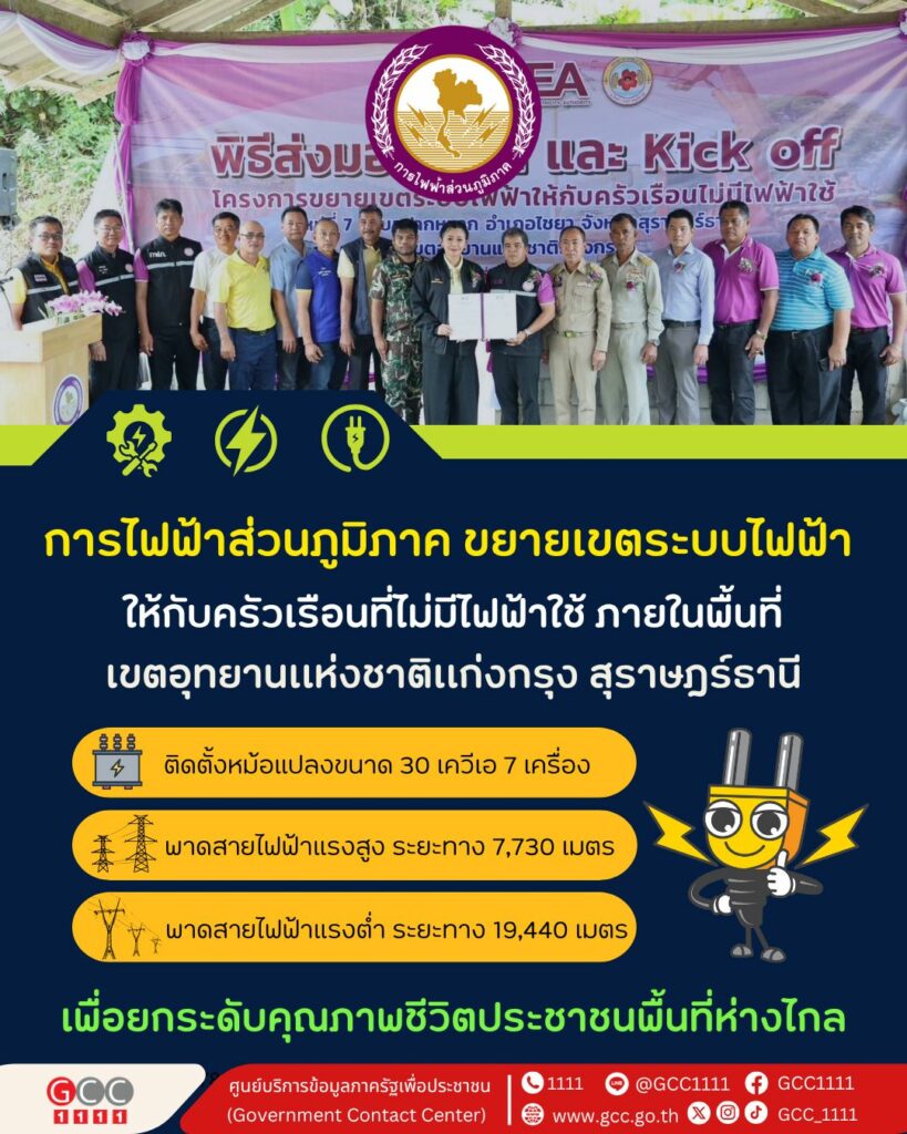 การไฟฟ้าส่วนภูมิภาค ขยายเขตระบบไฟฟ้าให้กับครัวเรือนไม่มีไฟฟ้าใช้ ภายในเขตอุทยานแห่งชาติแก่งกรุง จังหวัดสุราษฎร์ธานี ซึ่งโครงการนี้มีเป้าหมายจ่ายกระแสไฟฟ้าให้ครอบคลุมพื้นที่ภายในปี 2568 ตามนโยบายของรัฐบาล และยุทธศาสตร์ของกระทรวงมหาดไทย เพื่อยกระดับคุณภาพชีวิตของประชาชนในพื้นที่ห่างไกล และกระจายความเจริญอย่างทั่วถึงทุกภูมิภาค