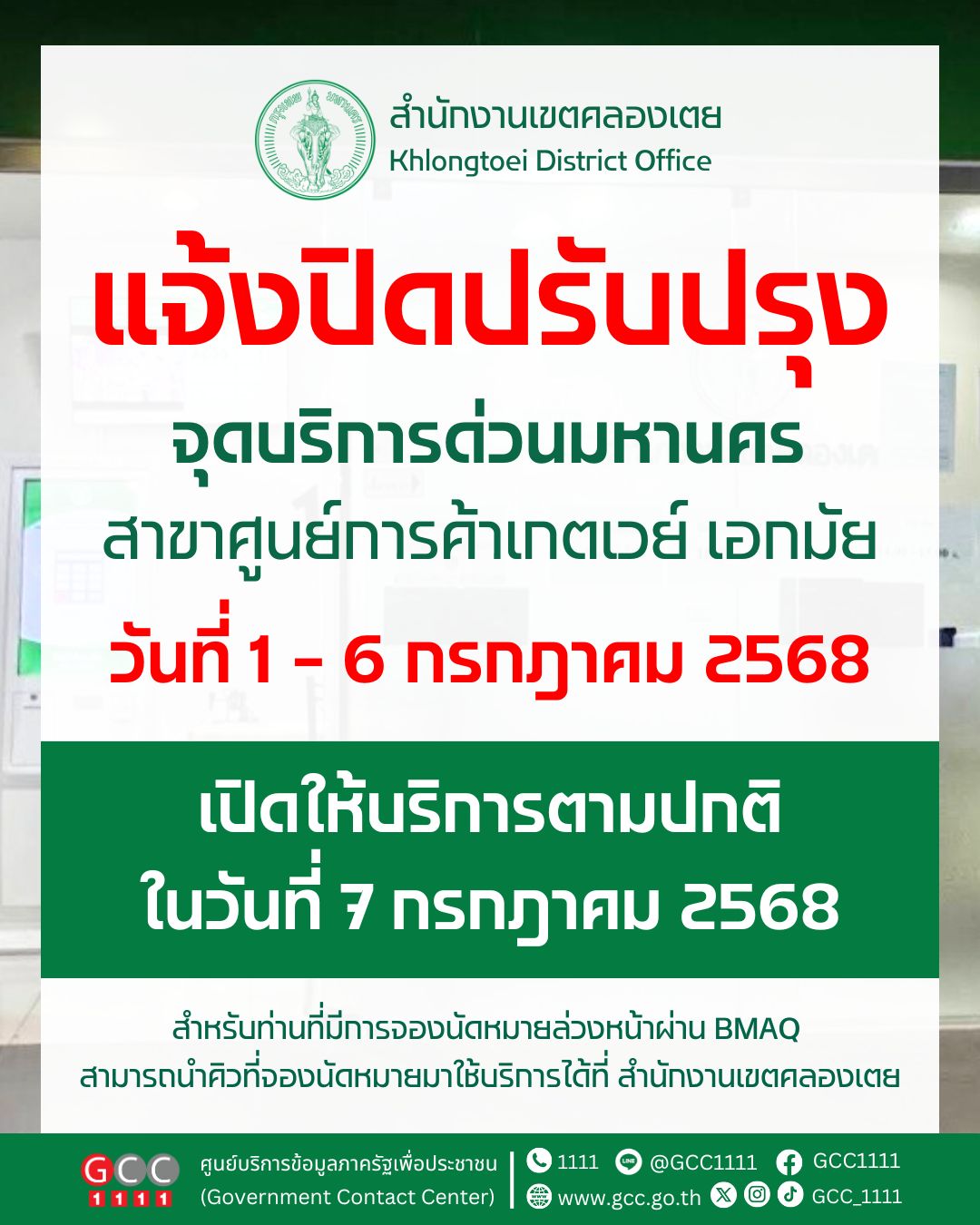 สำนักงานเขตคลองเตย แจ้งปิดปรับปรุงจุดบริการด่วนมหานคร สาขาศูนย์การค้าเกตเวย์ เอกมัย วันที่ 1 – 6 ก.ค. 68