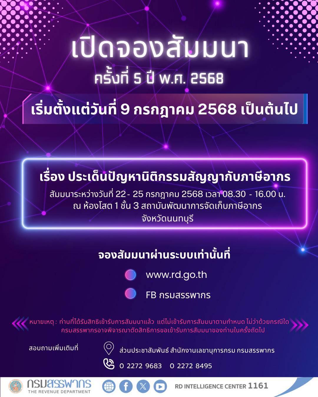 กรมสรรพากร จัดงานสัมมนาหัวข้อประเด็นปัญหานิติกรรมสัญญากับภาษีอากร ครั้งที่ 5 วันที่ 22 – 25 กรกฎาคม 2568 เวลา 08.30 – 16.00 น. ณ ห้องโสต 1 ชั้น 3 สถาบันพัฒนาการจัดเก็บภาษีอากร จังหวัดนนทบุรี ลงทะเบียนผ่านทางเว็บไซต์ : www.rd.go.th Facebook : กรมสรรพากร