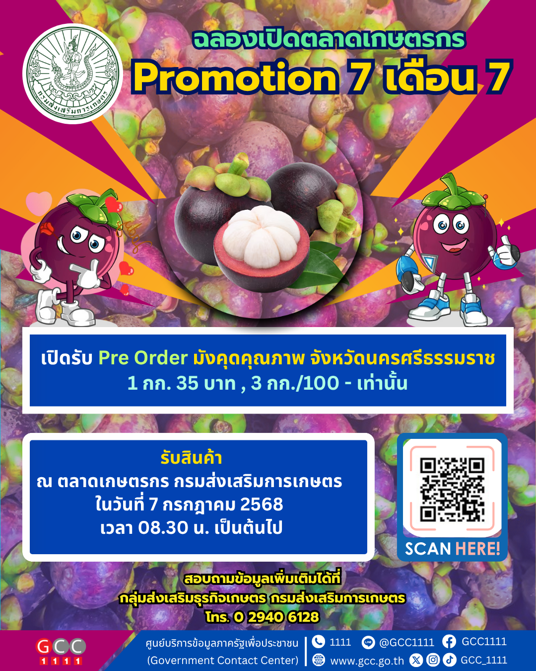 กรมส่งเสริมการเกษตร ฉลองเปิดตลาดเกษตรกร จัด Promotion 7 เดือน 7 มังคุดคุณภาพ จังหวัดนครศรีธรรมราช ราคา 35 บาทต่อกิโลกรัม (3 กิโลกรัม ราคา 100 บาท) เปิดรับ Pre Order ตั้งแต่บัดนี้ 6 กรกฎาคม 2568 เวลา 18.00 น. ได้ที่ คลิก สามารถรับของ ณ ตลาดเกษตรกร กรมส่งเสริมการเกษตร ในวันที่ 7 กรกฎาคม 2568 เวลา 08.30 น. เป็นต้นไป