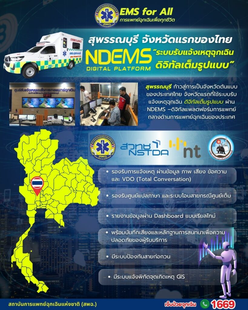 สพฉ. เผย จ.สุพรรณบุรี เปิดใช้ระบบรับแจ้งเหตุฉุกเฉินดิจิทัลเต็มรูปแบบผ่าน NDEMS เต็มระบบ จังหวัดแรกของไทย