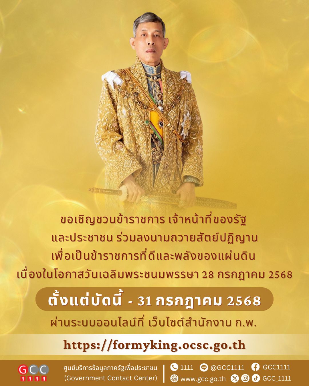 สำนักงานคณะกรรมการข้าราชการพลเรือน ขอเชิญชวนข้าราชการ เจ้าหน้าที่ของรัฐ และประชาชน ร่วมลงนามถวายสัตย์ปฏิญานเพื่อเป็นข้าราชการที่ดีและพลังของแผ่นดิน เนื่องในโอกาสวันเฉลิมพระชนมพรรษา 28 กรกฎาคม 2568 ตั้งแต่บัดนี้ – 31 กรกฎาคม 2568 ผ่านระบบออนไลน์ที่ เว็บไซต์สำนักงาน ก.พ. https://formyking.ocsc.go.th