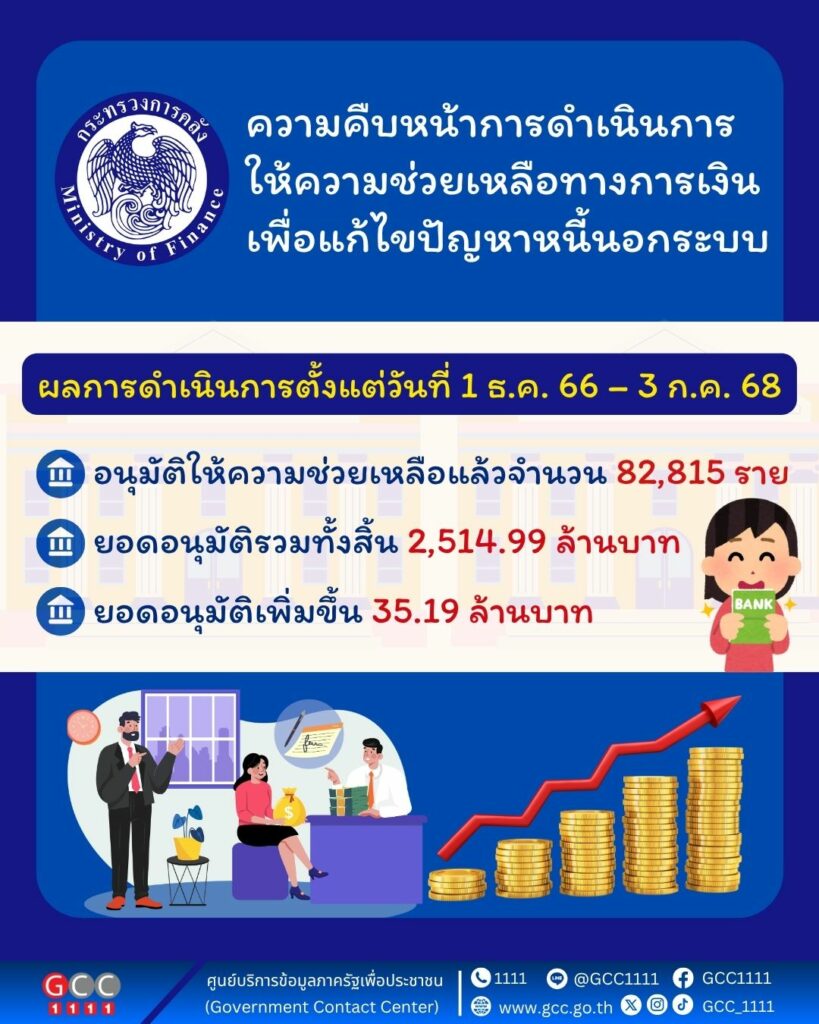 นายพรชัย ฐีระเวช ผู้อำนวยการสำนักงานเศรษฐกิจการคลัง ในฐานะโฆษกกระทรวงการคลัง เปิดเผยความคืบหน้าของการดำเนินการให้ความช่วยเหลือทางการเงินเพื่อแก้ไขปัญหาหนี้นอกระบบของกระทรวงการคลังที่ร่วมกับสถาบันการเงินเฉพาะกิจ ได้แก่ ธนาคารออมสิน และธนาคารเพื่อการเกษตรและสหกรณ์การเกษตร ผ่านมาตรการสินเชื่อต่าง ๆ ได้แก่ โครงการสินเชื่อธนาคารประชาชน สินเชื่อเพื่อชำระหนี้สินนอกระบบ สินเชื่อกองทุนหมุนเวียนเพื่อช่วยเหลือเกษตรกรผู้ยากจน มาตรการสินเชื่อเพื่อช่วยเหลือและรองรับลูกหนี้นอกระบบที่ลงทะเบียนแก้ไขปัญหาหนี้นอกระบบ สินเชื่อสร้างงานสร้างอาชีพ และสินเชื่อสร้างเครดิต สร้างโอกาส โดยผลการดำเนินการตั้งแต่วันที่ 1 ธันวาคม 2566 – 3 กรกฎาคม 2568 มีประชาชนที่เป็นหนี้นอกระบบได้รับอนุมัติให้ความช่วยเหลือทางการเงินไปแล้วจำนวน 82,815 ราย ยอดอนุมัติรวมทั้งสิ้น 2,514.99 ล้านบาท เพิ่มขึ้นจากผลการดำเนินการ ณ วันที่ 19 มิถุนายน 2568 จำนวน 1,418 ราย และมียอดอนุมัติเพิ่มขึ้น 35.19 ล้านบาท