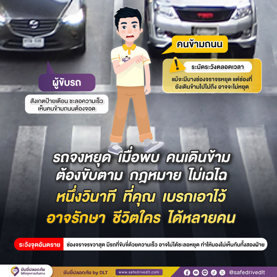 - รถต้องจอด เมื่อมีคนข้ามถนน และห้ามจอดทับทางม้าลาย